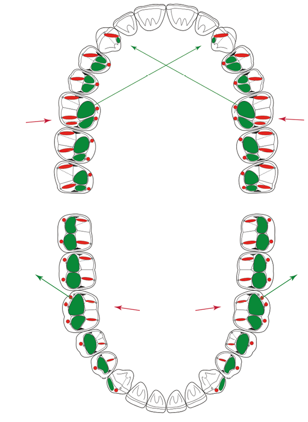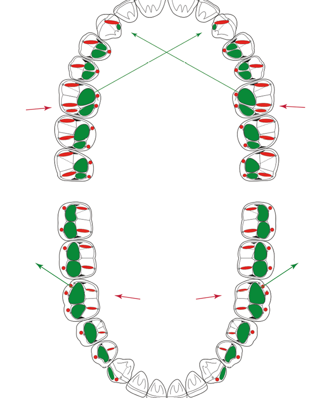 Jusqu’à présent, la mastication avait été analysée en quelque sorte indépendamment des dents et même l’instrumentation actuelle, numérique, reste principalement orientée vers la transmission des paramètres de réglage des articulateurs mécaniques ou virtuels, tout en autorisant ceux qui le souhaitent, à établir des comparaisons entre les formes du cycle et l’observation directe des tracés marqués au papier d’occlusion en bouche, sur les dents, pendant la mastication.