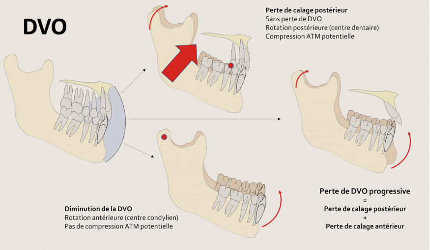 La variation de la dimension verticale d’occlusion (DVO) est une rotation antérieure autour de l’axe de bi-condylien, elle est sans contrainte pour l’ATM. La perte de calage postérieur correspond, au contraire, à une rotation mandibulaire postérieure autour du point de contact occlusal distal, cette situation peut être critique pour l’ATM [24] (fig. 1).