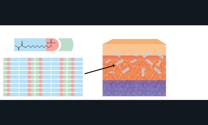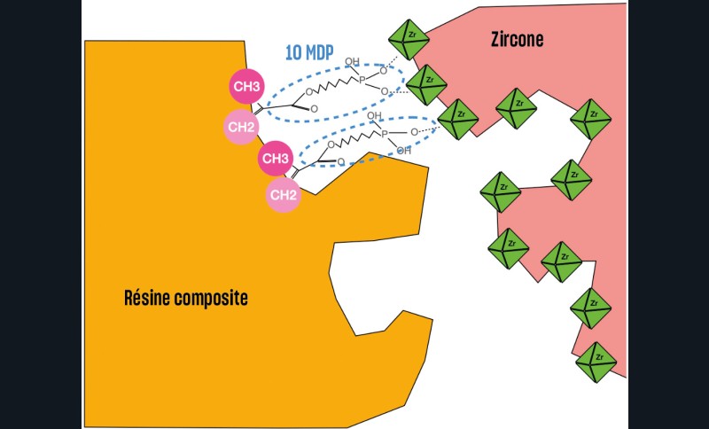 Selon la littérature récente, un sablage de particules d’alumine de 50 µm de diamètre sous une pression de 2 bars pendant 10 à 15 secondes, perpendiculairement à la surface de l’intrados prothétique, est préféré [2]. Ce traitement de surface vise, encore une fois, à augmenter la rugosité de cette dernière [3]. Enfin, le nettoyage de cette surface par un jet de vapeur favoriserait l’adhérence des molécules de 10-MDP. La surface des céramiques en zircone est entièrement constituée de cristaux peu propices à une réaction chimique avec les acides de mordançage ou avec les adhésifs classiques. Pourtant, le 10 MDP est capable d’être l’agent de couplage entre la surface de la restauration et le composite de collage [2]. Dans les protocoles de collage de la zircone, il est indispensable d’utiliser un apprêt et un composite de collage contenant des molécules de 10-MDP [2, 22]. Comme illustré en fig. 9, la molécule de 10-MDP est le monomère fonctionnel le plus fiable pour former une liaison chimique stable entre ses esters phosphates avec les groupes hydroxyles sur la surface passive de la zircone [24]. Compte tenu de la performance apportée par les molécules de 10 MDP, la pratique d’un sablage tribochimique et l’utilisation d’un silane conventionnel ne sont plus d’actualité. Les études cliniques à long terme montrent une grande durée de vie des bridges cantilever antérieurs avec une armature en zircone et, par voie de conséquence, une grande longévité de l’efficacité des composants de leur assemblage, surtout lorsqu’ils contiennent du 10 MDP comme le Panavia 21® ou Panavia F2.0® (Kuraray) [22].