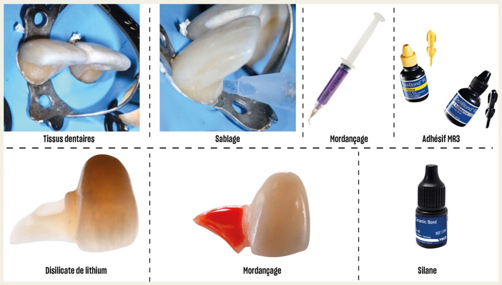 Aujourd’hui, la composition des bridges cantilever antérieurs se résume à un choix binaire entre une structure monolithique en disilicate de lithium et une structure composée d’une armature en céramique polycristalline de type zircone, comme la 3Y-TZP, recouvert par une céramique cosmétique feldspathique. C’est à travers ces deux cas de figure que seront déclinés leurs protocoles de collage respectifs ainsi que les conseils pratiques permettant d’optimiser la performance du système adhésif.