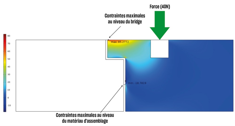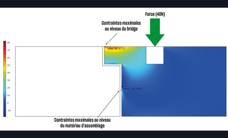 Même si, en termes de résistance aux contraintes mécaniques, la supériorité des bridges cantilever sur les bridges conventionnels est maintenant parfaitement démontrée, la sélection d’un système de collage judicieux est un élément central pour la pérennité du traitement prothétique [3]. En effet, particulièrement dans le cadre de ces restaurations, les contraintes occlusales doivent être en partie absorbées par le matériau d’assemblage (fig. 1). Il convient donc de bien choisir le système de collage utilisé en considérant le niveau de ses propriétés adhésives et la nature du matériau constituant la restauration (tableau 1).