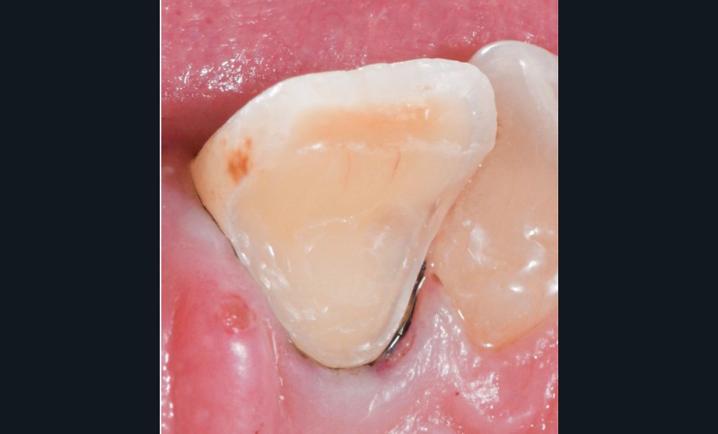 Les céramiques polycristallines à base de zircone présentent des propriétés mécaniques très intéressantes (résistance à la flexion entre 500 et 1 200 MPa et module de Young de 210 GPa) [21, 22]. La résistance à la rupture des zircones de type 3Y-TZP indiquent leur utilisation dans les armatures des bridges cantilever. Les autres familles de zircone (5 à 8 Y-TZP), de plus faibles propriétés mécaniques, ne sont pas recommandées pour des éléments prothétiques comme les bridges. Une céramique cosmétique de recouvrement est positionnée sur l’extrados de cette armature en zircone afin d’obtenir une meilleure intégration esthétique de la restauration. L’intrados concerne donc l’armature et le protocole d’assemblage doit être adapté à la composition de celle-ci. Les études rapportent un faible nombre de cas de décollement (4,8 à 7,1 %), dont la plupart sont d’origine traumatique [23]. Une attention particulière doit être apportée à l’intégration occlusale de ces restaurations. La nature polycristalline dépourvue de silice de ces armatures en zircone demande un traitement de surface et un système adhésif spécifiques, comme illustré sur un bridge cantilever postérieur en fig. 8.