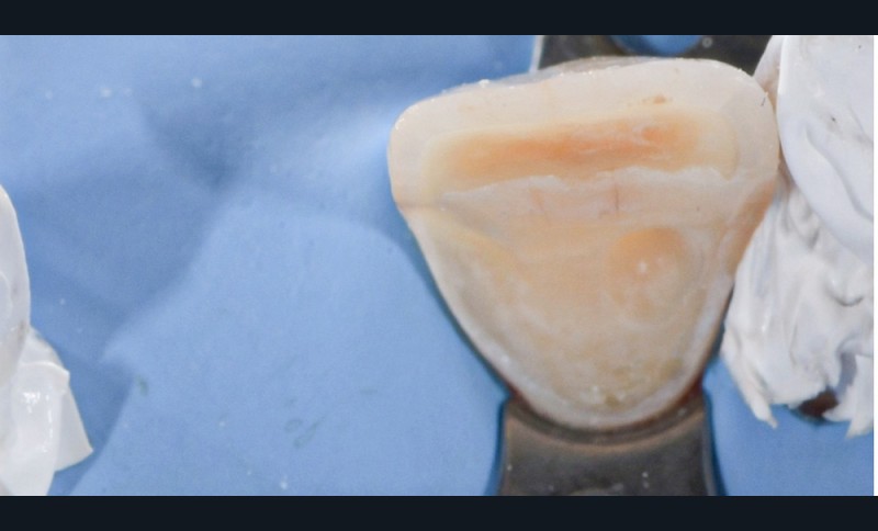 Après l’ensemble de ces étapes, rassemblées dans la fig. 3, il ne reste plus à réaliser que l’enduction d’un composite fluide sur la totalité de la surface de l’intrados prothétique avant le positionnement de la restauration sur la préparation dentaire.