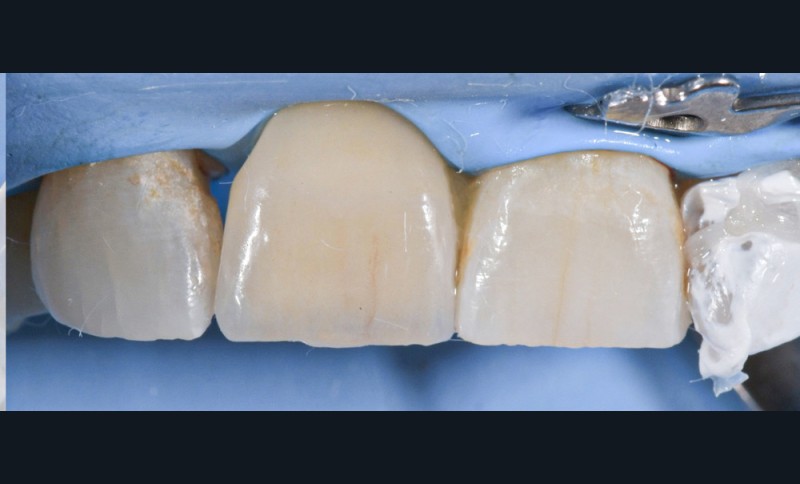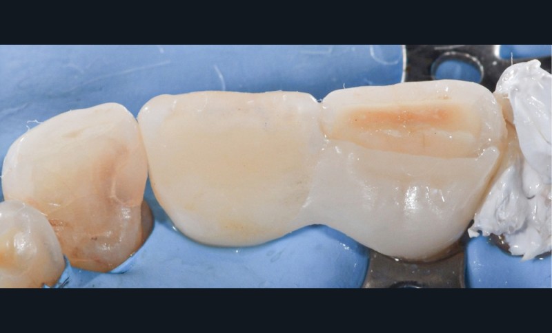 L’assemblage de ce bridge présentant une armature en zircone a été réalisé avec une colle avec potentiel adhésif (Panavia F2.0® (Kuraray)) et avec le concours d’un sablage à l’alumine sur l’intrados de l’ailette du bridge. Comme le montre la fig. 11b, l’intrados a été crayonné afin de visualiser les effets du sablage et ainsi s’assurer de sa bonne réalisation. L’apprêt a ensuite été posé sur toute la surface de l’intrados prothétique.