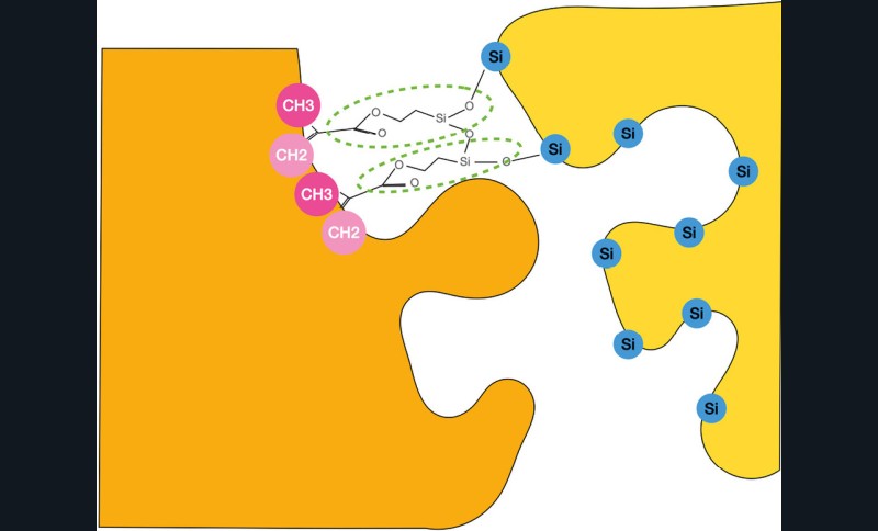 Le protocole le mieux adapté au disilicate de lithium est celui des colles sans potentiel adhésif [10]. La liaison micromécanique à la surface de l’intrados prothétique entre la céramique et le composite de collage est provoquée par la création d’une micro-rugosité de surface au moyen d’un mordançage. Aujourd’hui encore, ce traitement de surface par l’acide fluorhydrique est le procédé le mieux décrit dans la littérature [11]. Il s’agit donc d’une application, à la surface de l’intrados prothétique, d’un gel d’acide fluorhydrique à 5 % de concentration pendant strictement 20 secondes. Le respect de cette simple application permet une préparation optimale de la surface sans être trop agressif pour la structure du matériau [12]. Cependant, l’utilisation et l’élimination de l’acide fluorhydrique posent des problèmes. Son remplacement par d’autres agents comme des silanes automordançants fait toujours l’objet de plusieurs études de validation. La seconde étape de la préparation de la surface de l’intrados prothétique est l’application d’un agent de couplage responsable des liaisons chimiques. Les silanes sont des molécules bi-fonctionnelles réagissant d’un côté par leurs groupements silanols (Si-OH) avec la silice composant la surface de la céramique et, de l’autre, par leurs groupement organo-fonctionnels (OCH2) avec la matrice résineuse du composite de collage (fig. 2). Les liaisons covalentes induites par la présence du silane augmentent l’adhésion du composite de collage à la surface prothétique [13].