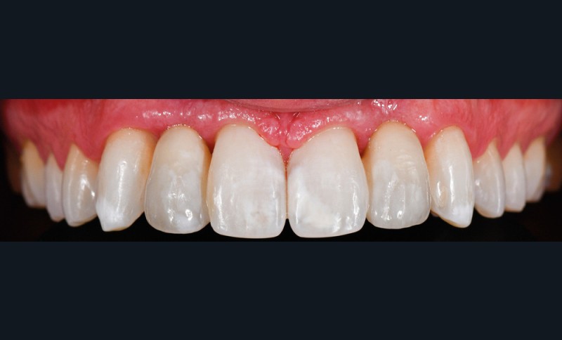 L’assemblage de ces bridges en disilicate de lithium a été réalisé avec une colle sans potentiel adhésif avec l’application d’acide fluorhydrique et de silane sur l’ailette du bridge et l’application, sous champ opératoire, d’un sablage, d’acide orthophosphorique puis de l’adhésif sur les surfaces dentaires préparées (fig. 5). Le résultat postopératoire est illustré en fig. 6.