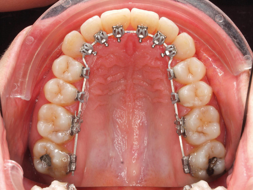 1. Appareil lingual posé en bouche. ✔ Les principes de l’orthodontie linguale sont les mêmes que ceux de l’orthodontie vestibulaire : l’appareillage lingual est constitué d’attaches (brackets), qui sont collées sur les faces linguales ou palatines de chaque dent et reliées par un arc dentaire. Ce fil métallique plié sera changé régulièrement de façon à déplacer les dents en exerçant une pression légère. La principale différence avec l’orthodontie vestibulaire réside dans l’individualisation précise de chaque attache pour qu’elle s’adapte à l’anatomie spécifique des faces linguales des dents. ✔ Sur le plan mécanique, les attaches linguales déplacent donc les dents en les tirant ou les poussant comme le font les brackets externes vestibulaires : elles permettent donc les mêmes résultats. |