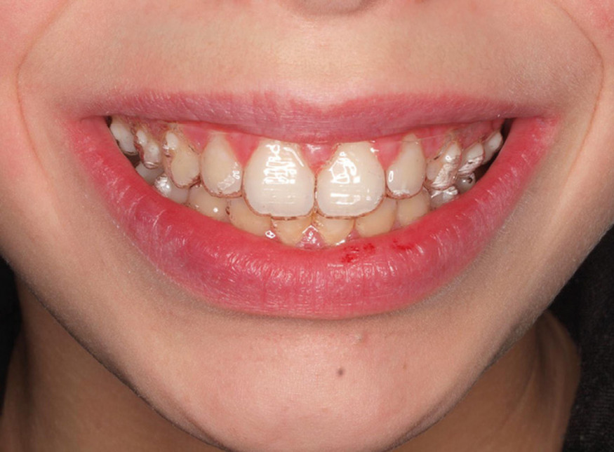 2. Patient avec un aligneur et des taquets sur les prémolaires. ✔ Le principe d’un traitement par aligneurs est basé sur le port successif de gouttières en plastique transparent. À partir d’une simulation informatique du résultat souhaité, toutes les étapes de déplacement dentaire sont individualisées et une série de gouttières thermoformées est fabriquée. Le port de ces aligneurs 22h/24h va déplacer petit à petit chacune des dents pour obtenir le résultat final escompté. ✔ Les aligneurs fonctionnent uniquement par poussée et enferment les dents dans des logements ayant la forme et la position de la dent déplacée : souvent, il est utile de rajouter des taquets en composite qui forment des reliefs collés sur les dents pour améliorer la réalisation du mouvement. |
