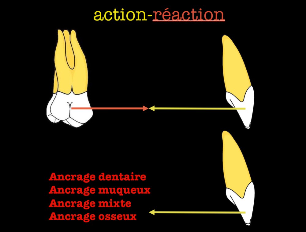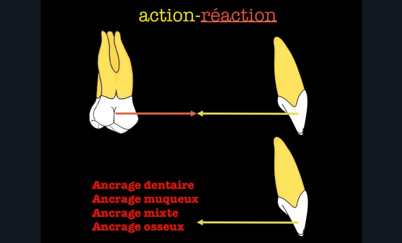 Lorsque l’on met un dispositif élastique entre deux dents pour en déplacer une (action), l’autre dent peut se déplacer (réaction) (2). Il y a une résistance dentaire au déplacement. Ainsi le déplacement est fonction du nombre de racines dentaires (plus la dent a de racines, moins elle se déplace facilement), de sa situation maxillaire ou mandibulaire (les dents mandibulaires et particulièrement les molaires se déplacent moins facilement) et de la hauteur de l’os alvéolaire (déplacement plus facile sur parodonte réduit, mais assaini) (3) (fig. 1).