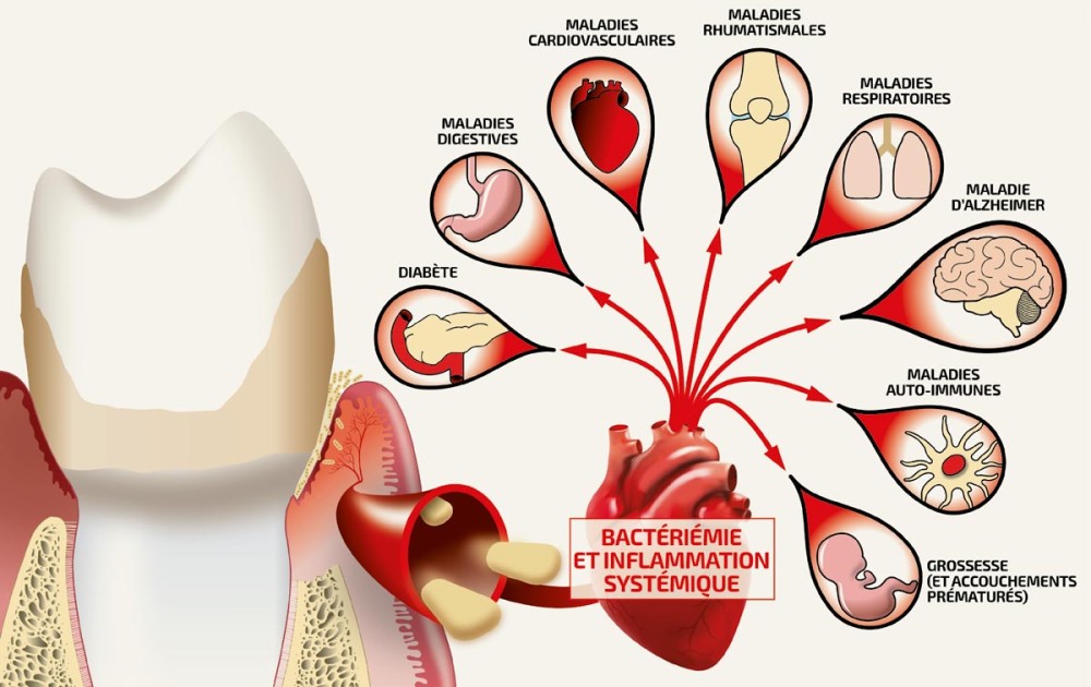 Dans le cas contraire, la mastication notamment provoque la dissémination des pathogènes et/ou de leurs sous-produits (SP’s) depuis la poche parodontale vers la circulation sanguine, par laquelle ils peuvent induire une inflammation systémique, voire atteindre un organe. Le fait que les bactéries parodontales puissent induire des infections métastatiques à distance dans un site non oral est appelé « théorie de l’infection focale » par l’atteinte d’un lieu spécifique appelé locus minor resistentiae (lieu de moindre résistance) (LMR). L’augmentation de l’inflammation systémique et/ou locale au sein du LMR peut perturber et aggraver des maladies ou conditions existantes comme les maladies cardiovasculaires (MCV) [1-4], le diabète [5-9], la grossesse [10-12] et les maladies auto-immunes telles que la polyarthrite rhumatoïde [2-20], le lupus érythémateux [13-17], les pathologies respiratoires [18-24] ou les maladies cognitives [25-28].