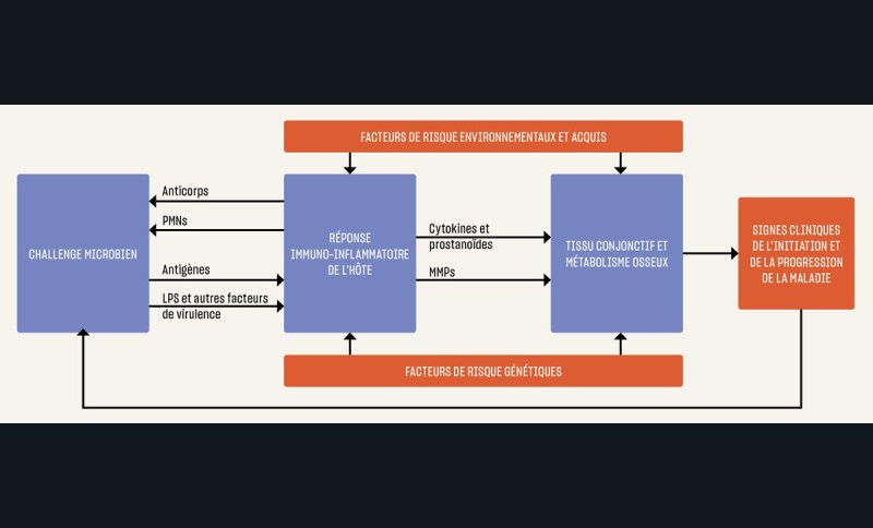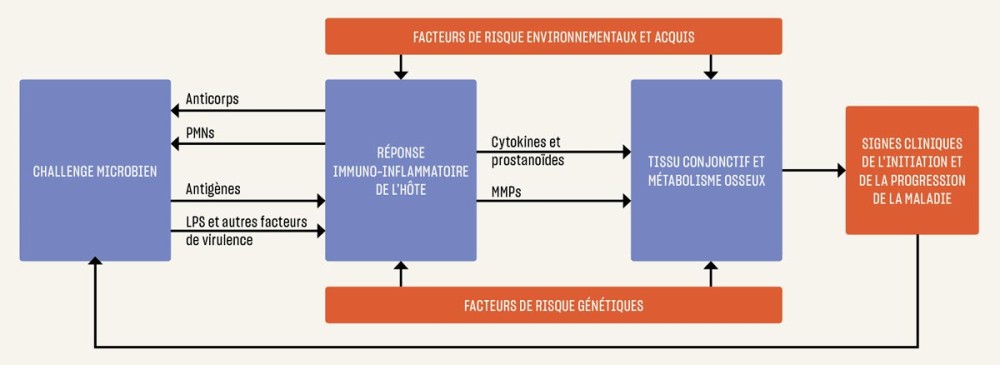 La présence de biofilm au sein des espaces gingivo-dentaires induit une réponse immuno-inflammatoire qui peut être protectrice (en cas de maintien d’un parodonte sain) ou destructrice (en cas de présence d’une parodontite). Par ailleurs, les pathogènes présents au sein de ce biofilm possèdent des facteurs de virulence capables autant de détruire les tissus parodontaux que de neutraliser les défenses immunitaires de l’hôte, ce qui participe à la progression de la maladie.