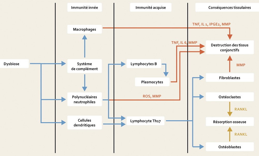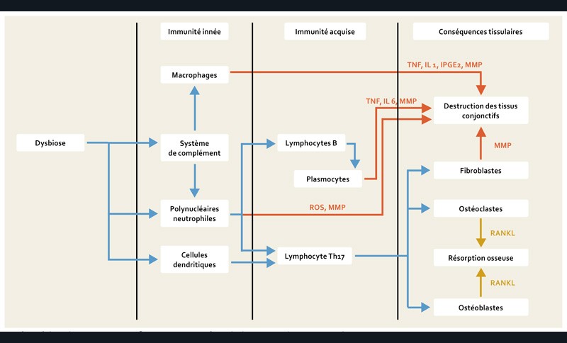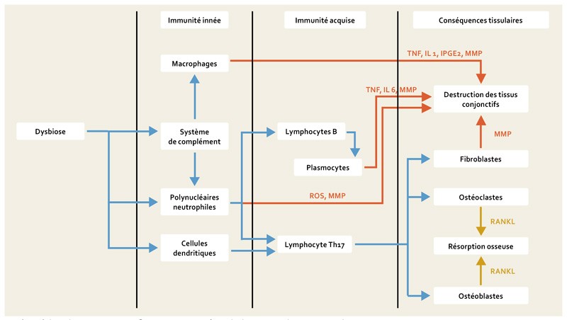 Un déséquilibre au niveau de la flore bactérienne (également appelé dysbiose), induit par certains pathogènes clés tels que Porphyromonas gingivalis ainsi que par d’autres facteurs de risque, entraîne une sur-activation de la réponse inflammatoire de l’hôte. C’est une réaction immuno-inflammatoire exagérée en réponse à la dysbiose microbienne qui mènera aux mécanismes pathologiques de destruction tissulaire dans la parodontite, comme la production de métallo-protéinases matricielles (MMP) [3, 4]. Ces interrelations sont résumées dans la figure 1.