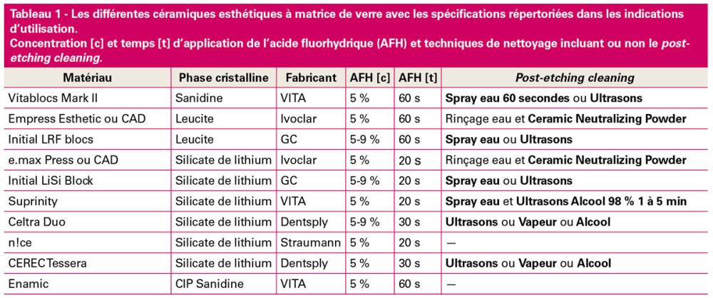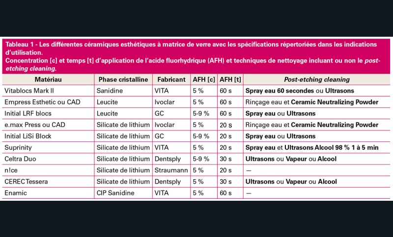 Après avoir été le premier praticien à proposer, en 1973, les attelles en métal collées [22], Alain Rochette récidive en 1975 en décrivant la première restauration partielle en céramique collée réalisée sur une incisive maxillaire fracturée [21]. À cette époque, le collage est encore débutant et l’on utilise uniquement un silane comme agent de couplage avec la céramique. Mais en 1983, Simonsen et Calamia [24] obtiennent après traitement à l’acide fluorhydrique à 7,5 % une augmentation très importante de l’adhérence à la céramique, et Horn [13] décrit une technique pour fabriquer et coller des facettes en céramique en associant le mordançage à l’acide fluorhydrique et un silane. Aujourd’hui, ce traitement de surface, associant l’acide fluorhydrique et un silane, est devenu le gold standard pour les céramiques esthétiques à matrice de verre [16, 27]. Dans leurs instructions d’utilisation (tableau 1), les fabricants préconisent la concentration et le temps d’application de l’acide fluorhydrique, adaptés à leur matériau ainsi que le mode de nettoyage incluant ou pas les techniques de post-etching cleaning (nettoyage après mordançage à l’acide fluorhydrique).