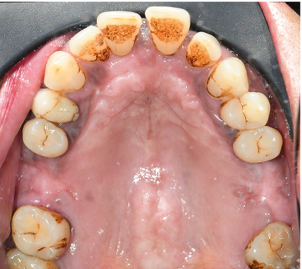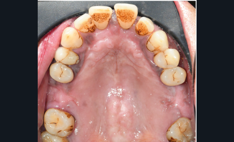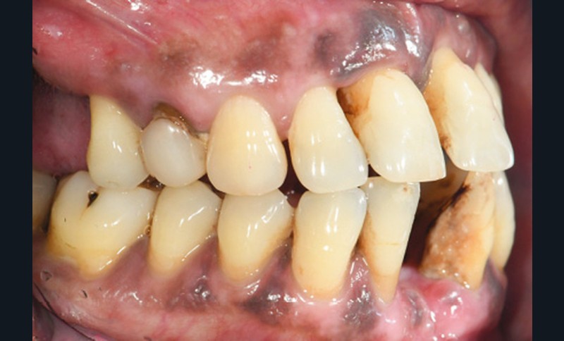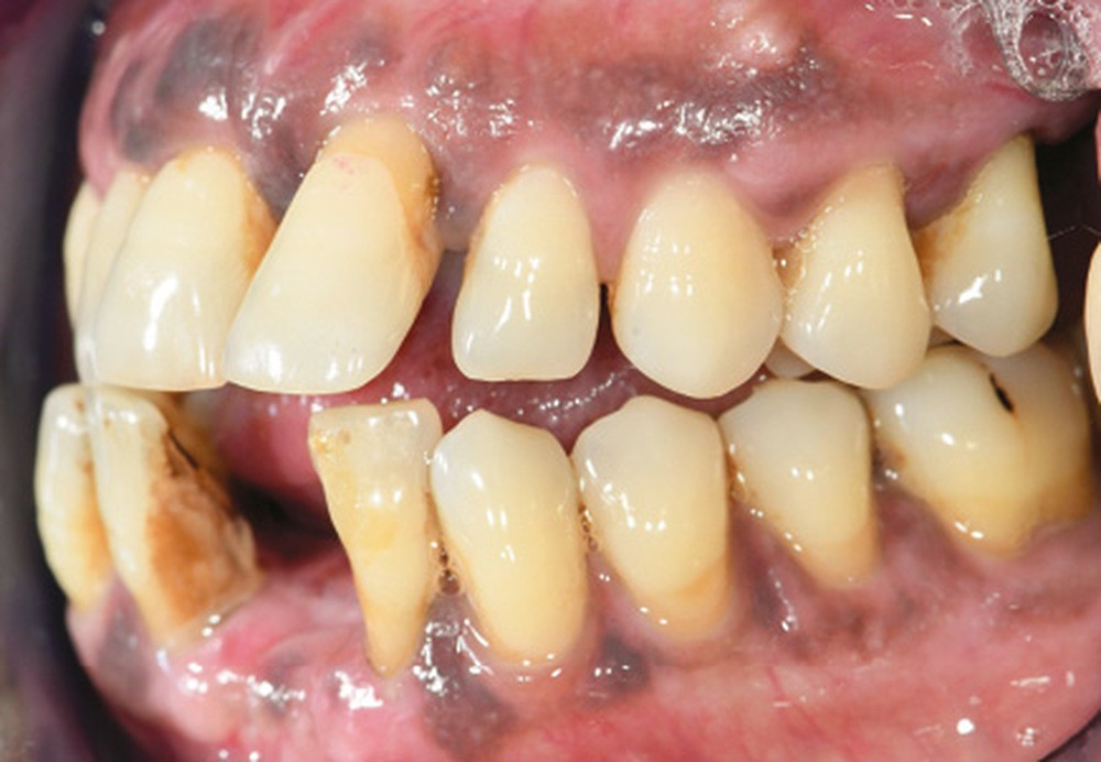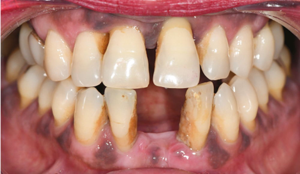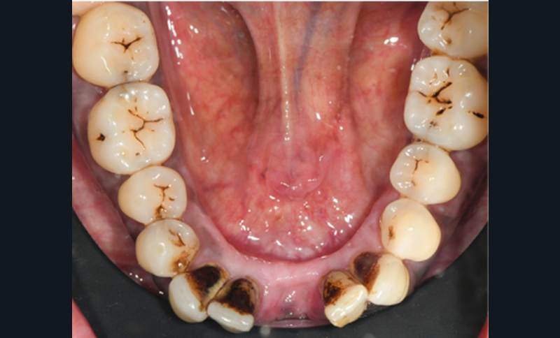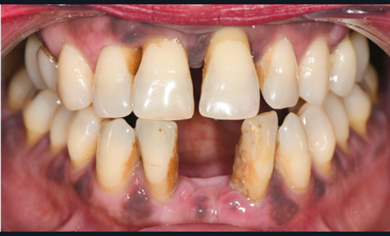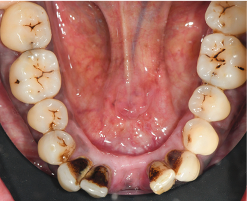 Une patiente de 49 ans consulte en parodontie après la perte spontanée de plusieurs dents au cours des deux années écoulées, dont deux incisives mandibulaires. Elle est fumeuse (15 paquets/années), mais se déclare en bonne santé et ne suit pas de traitements médicamenteux. Son suivi bucco-dentaire et médical est irrégulier. Elle n’a pas vu de chirurgien-dentiste ou de médecin depuis plusieurs années. Elle ne présente pas d’obésité. Il n’y pas d’antécédents de diabète connu dans sa famille.