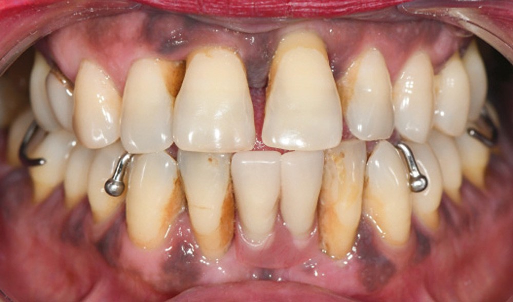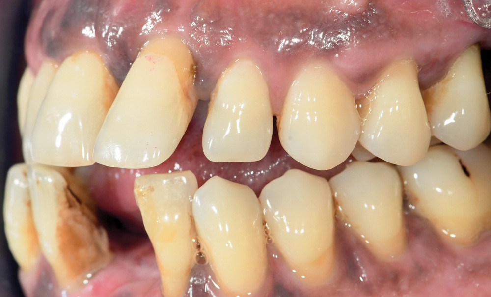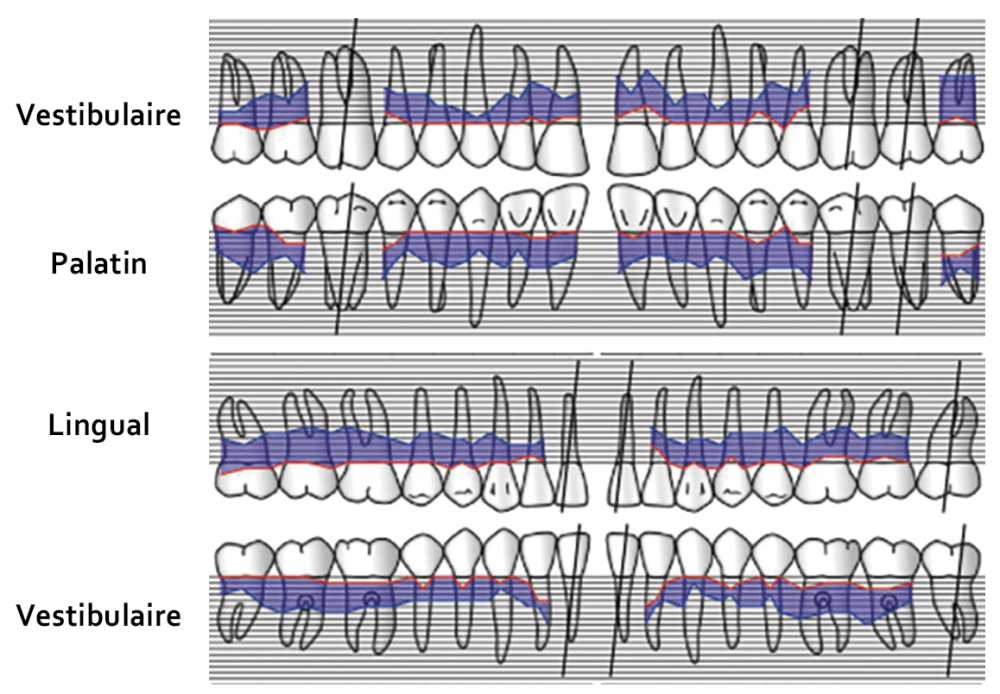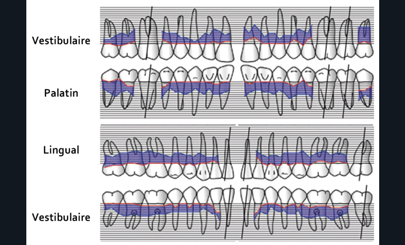 L’examen clinique (fig. 1) et le charting parodontal (fig. 2) montrent une inflammation gingivale et une perte d’attache généralisée, avec la présence de récessions et de poches parodontales profondes. La profondeur de sondage moyenne et le niveau d’attache moyen sont respectivement de 4,3 mm et – 4,9 mm, associés à un indice de plaque et un indice de saignement de 59 et 30 %. On note des migrations secondaires avec une égression et une vestibuloversion des incisives maxillaires.
