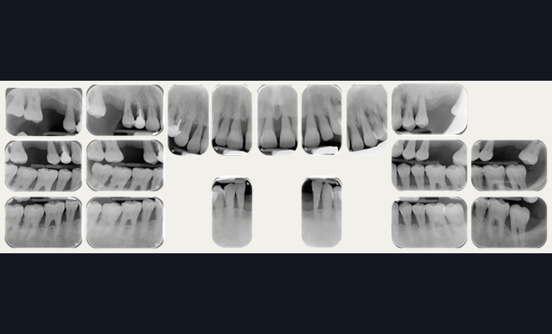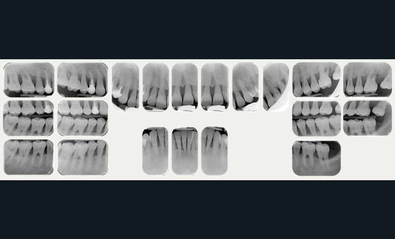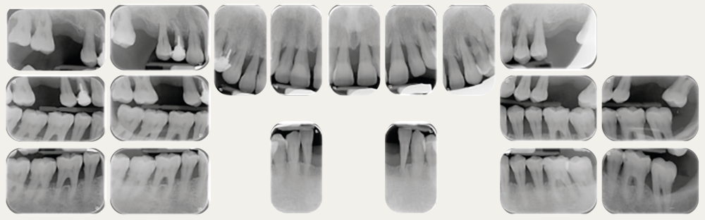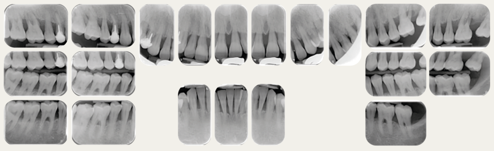 Les 16, 26, 27, 31 et 41 ont été perdues spontanément après avoir été mobiles. Le bilan radiologique (fig. 3) montre une alvéolyse généralisée sévère, dépassant la moitié de la hauteur radiculaire. La patiente rapporte avoir consulté en parodontie cinq ans auparavant. Un bilan long cône avait alors été réalisé (fig. 4).