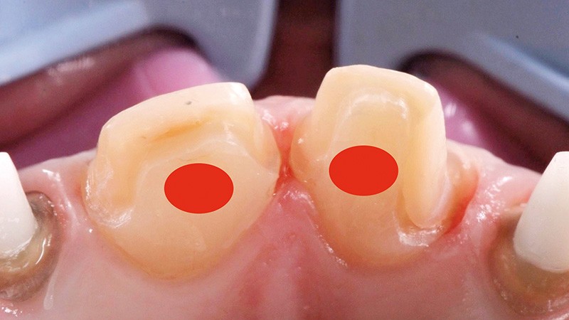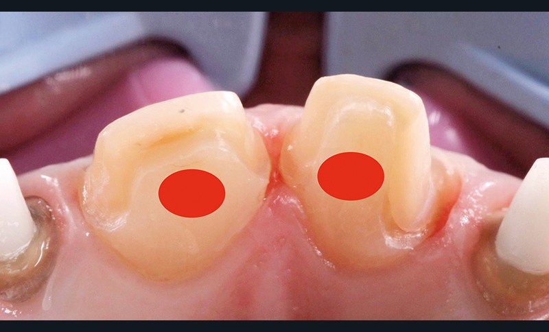 Le design d’une facette avec limites proximales dans le composite est spécifique et répond à des indications strictes. La Restauration Adhésive en Céramique (RAC) doit venir recouvrir ces composites proximaux et une préparation avec un retour palatin/lingual s’impose de manière à venir chercher une limite amélaire et maximiser la surface d’émail pour le collage (fig. 1). Cependant, si cela doit conduire le praticien à empiéter sur la zone du cingulum (très sollicitée mécaniquement, en rouge sur la figure 1), il y a un risque d’échec de la RAC [1, 2]. Dans ce cas particulier, il sera préférable de garder une limite occlusale interne au composite.