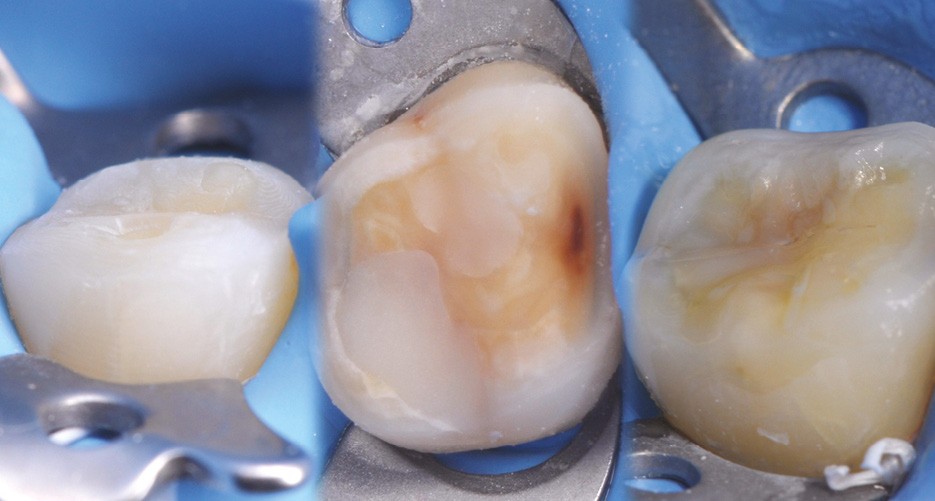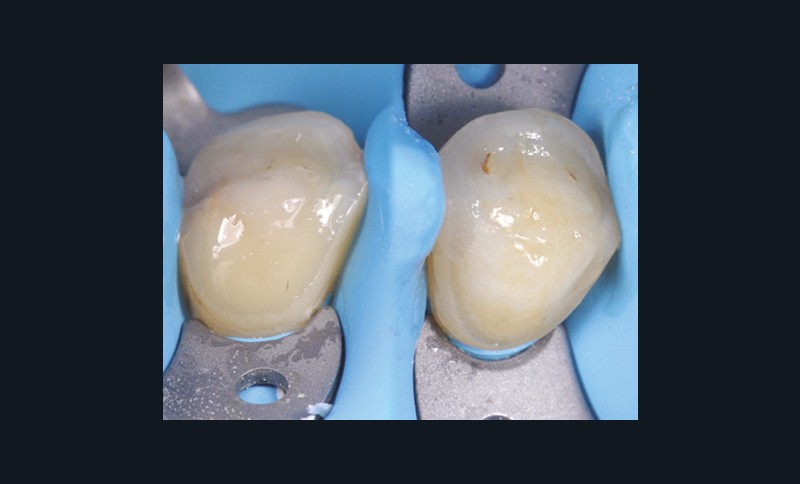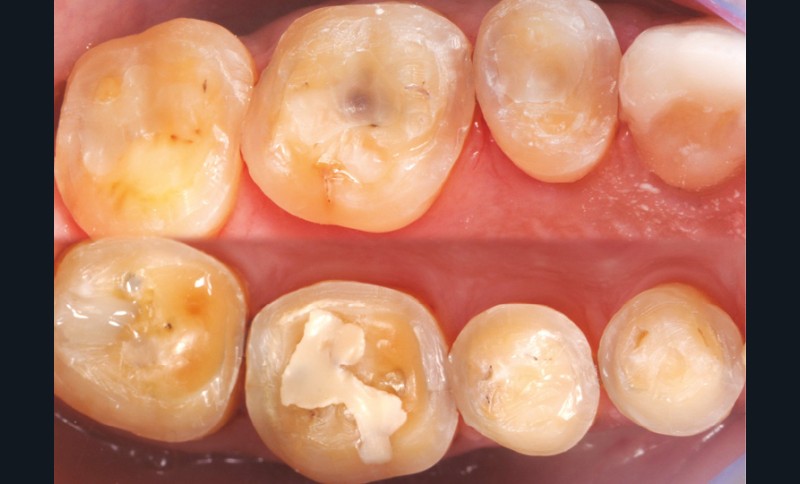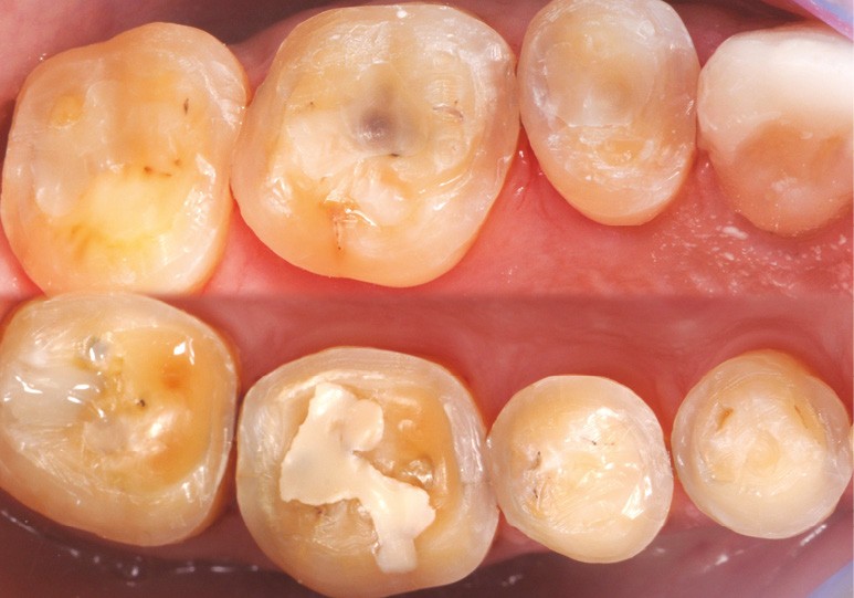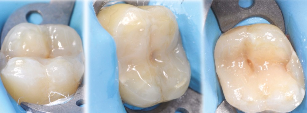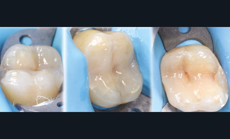 Leurs indications cliniques sont particulièrement fréquentes dans les contextes d’usure érosive pour lesquels il est souvent nécessaire d’augmenter la dimension verticale d’occlusion (DVO) afin d’ouvrir l’espace anatomique antérieur (fig. 5 et 6). Leur dénomination, qui dépend de leur niveau de recouvrement, varie du table top (fig. 7) au veneerlay (recouvrement des faces occlusale et vestibulaire sur de faibles épaisseurs et en intra-amélaire) (fig. 8 et 9). Mais leur indication est aussi posée sur les dents fissurées (« craked tooth syndrome »), dans les cas de dents présentant une fragilisation cuspidienne ou encore en présence d’une dent postérieure en infraposition occlusale.