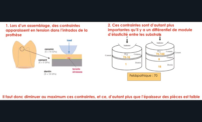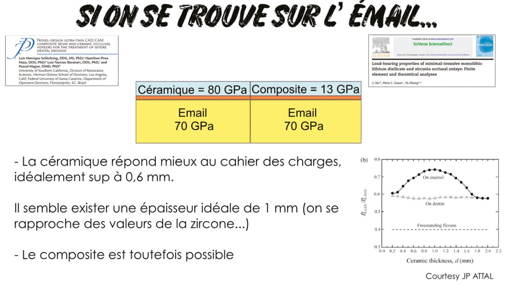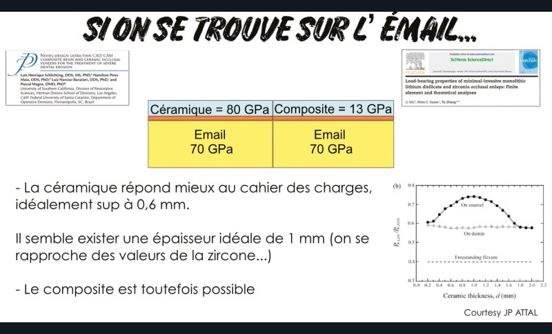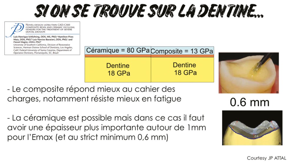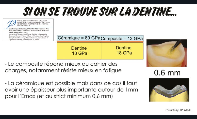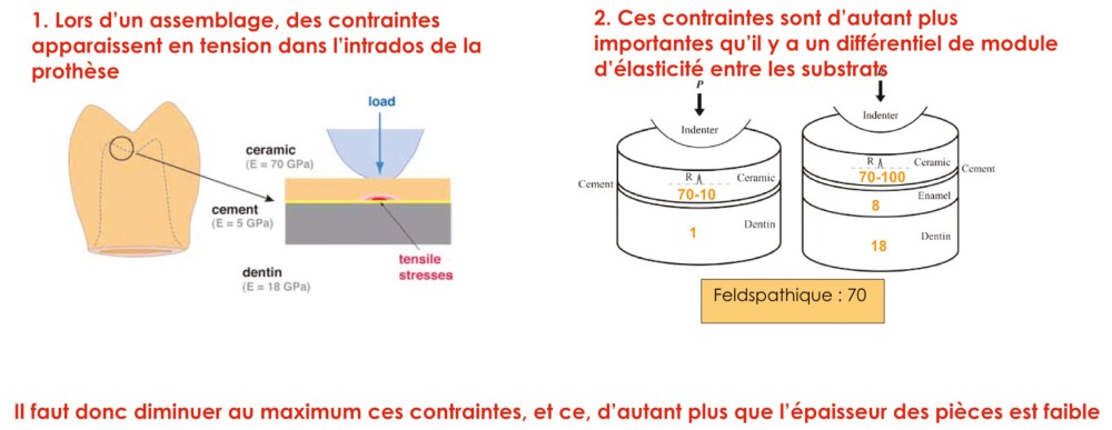 Les épaisseurs de préparation varient donc selon la nature du support. De 0,6 à 1 mm d’épaisseur sur l’émail jusqu’à 1,5 mm sur la dentine ou le composite afin d’être en adéquation avec les modules d’élasticité des matériaux de restauration utilisés (céramique ou composite).