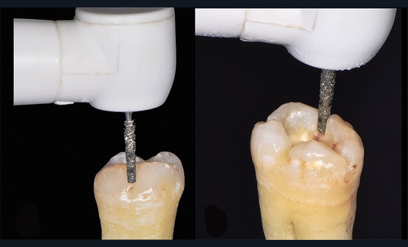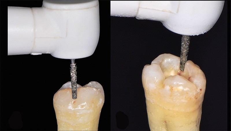 La principale particularité dans la préparation d’une endocouronne est la réalisation d’un trottoir cervical plat orienté parallèlement aux plans d’occlusion. Comme pour toute reconstruction en céramique vitreuse, fut-elle renforcée, c’est une contrainte en compression que l’on cherche à faire subir au matériau collé. Ce trottoir cervical, encore appelé « butt joint » par les Anglo-Saxons, est préférentiellement réalisé en supra-gingival. Fasbinder distingue les restaurations dont les limites sont réalisées au-dessus de la ligne de plus grand contour, qu’il a baptisées « endo onlay », de celles dont les limites sont situées au-dessous de la ligne de plus grand contour, qu’il nomme « endocrown » (endocouronne). Le minimum de réduction occlusale est de 2 mm afin d’assurer la pérennité du matériau de reconstruction.