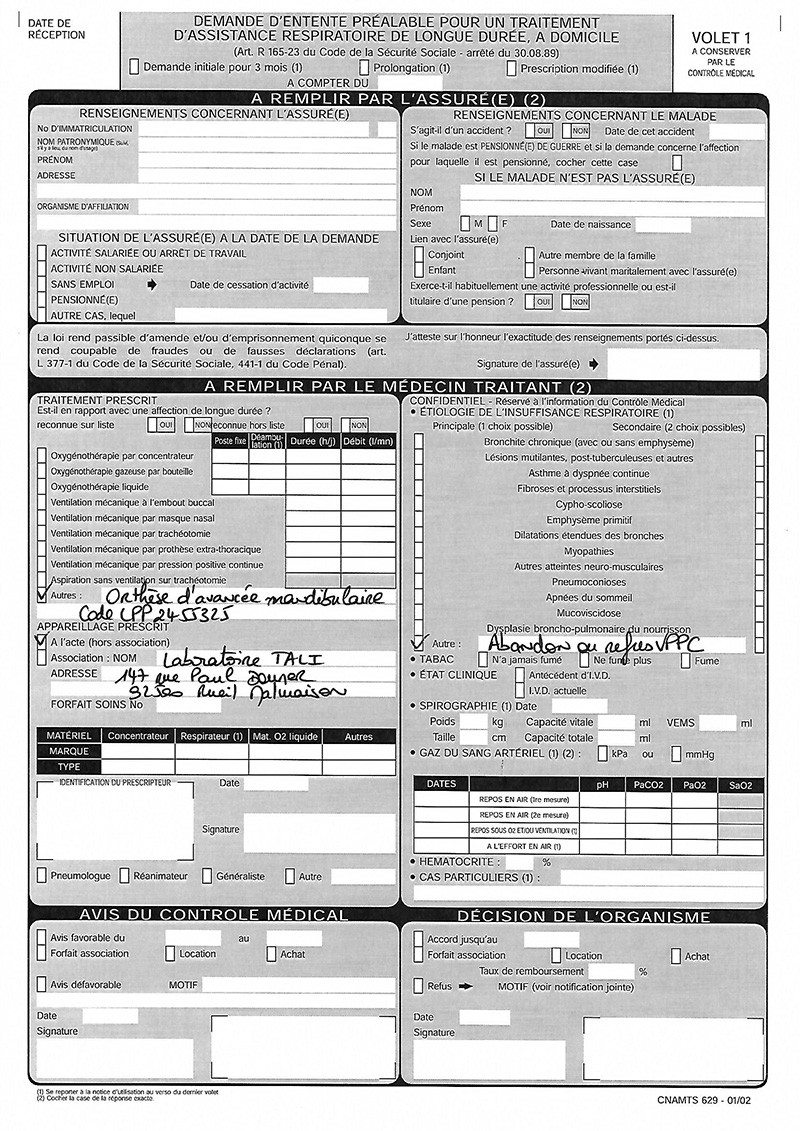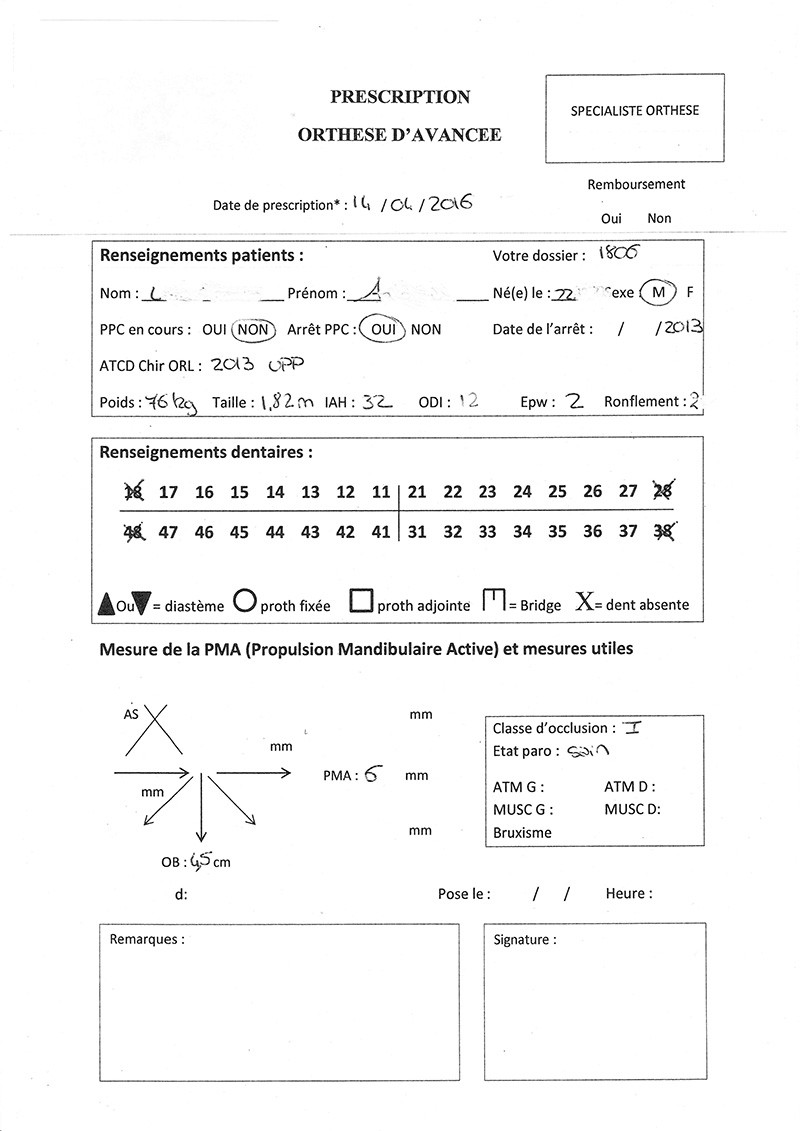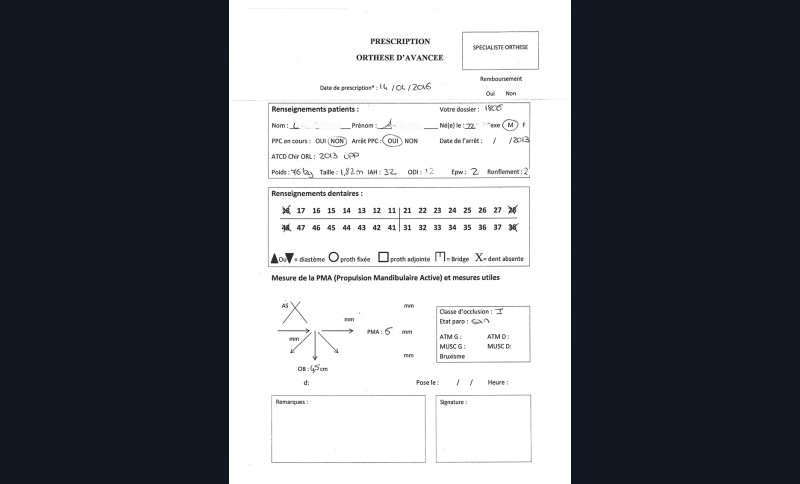 • les orthèses de port différé (orthèses fabriquées sur mesure), qui nécessitent une prise d’empreinte et qui sont réalisées en laboratoire. Il en existe de nombreux modèles et six d’entre elles sont prises en charge par la sécurité sociale, après demande d’entente préalable (fig. 2). Suite à son diagnostic, le praticien prend une empreinte à l’alginate de chaque arcade, évalue l’avancée mandibulaire nécessaire, puis l’assistante remplit la fiche de prescription au laboratoire de prothèse en fonction des indications du praticien (fig. 3).