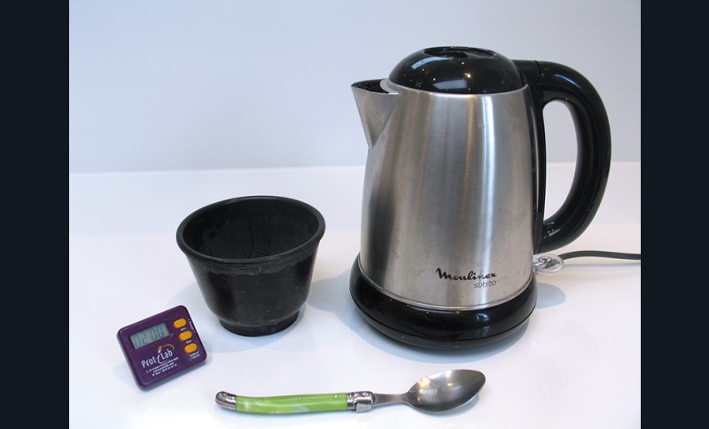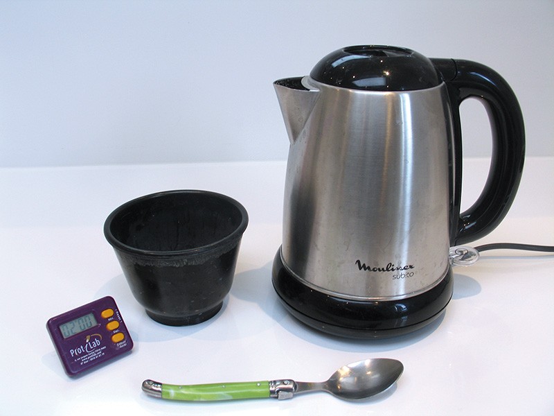 Nous préparons une bouilloire pour avoir de l’eau chaude, une cuillère, un bol (fig. 4) et nous ouvrons une boite d’orthèse qui comprend : un mode d’emploi, une boite de rangement, un patron (permettant de vérifier la bonne longueur des barrettes), deux jeux de barrettes millimétrées, et deux orthèses (un modèle standard, le plus fréquemment utilisé, et un modèle large) (fig. 5).