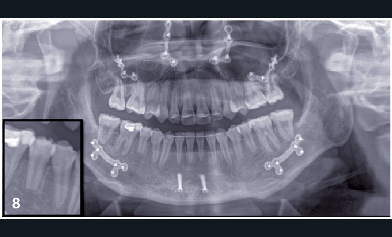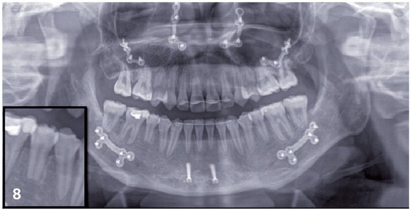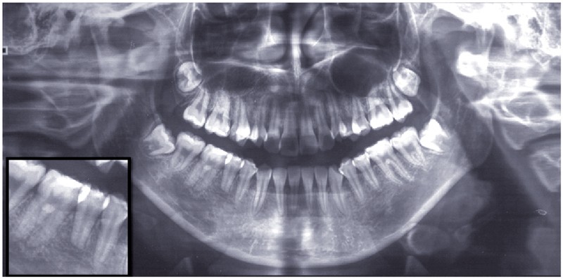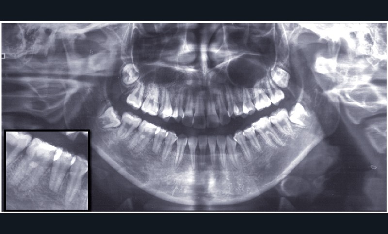 Le choix du plan de traitement s’est porté sur un traitement chirurgico-orthodontique avec réalisation d’une classe II thérapeutique afin de limiter les déplacements dentaires à l’arcade mandibulaire suite au dépistage de rhizalyses idiopathiques sur les prémolaires inférieures (fig. 3) et de l’absence d’encombrement.