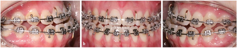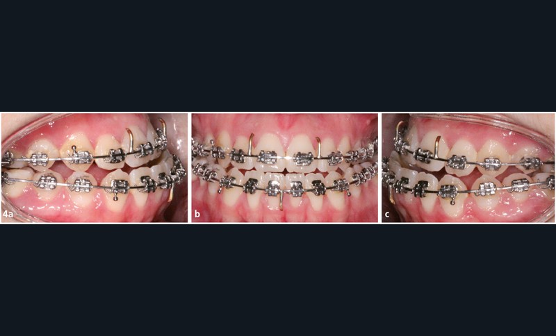 La séquence d’arcs a été différente au maxillaire : un acier .014 en by-pass sur les incisives latérales a dans un premier temps été mis en place afin d’éviter tout effet néfaste de vestibuloversion.
