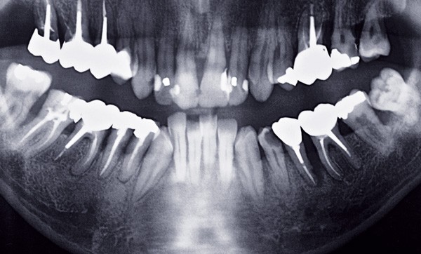 Le patient a fait l’objet à l’époque d’un bilan dentaire sous la forme d’un cliché panoramique (OPT) (fig. 1). Il présentait alors 14 dents au maxillaire (absence de 18 et 25), et une arcade complète à la mandibule.