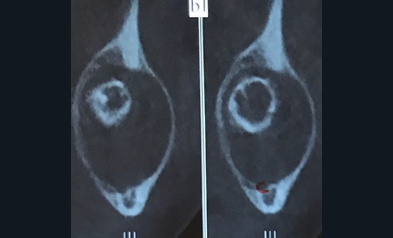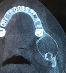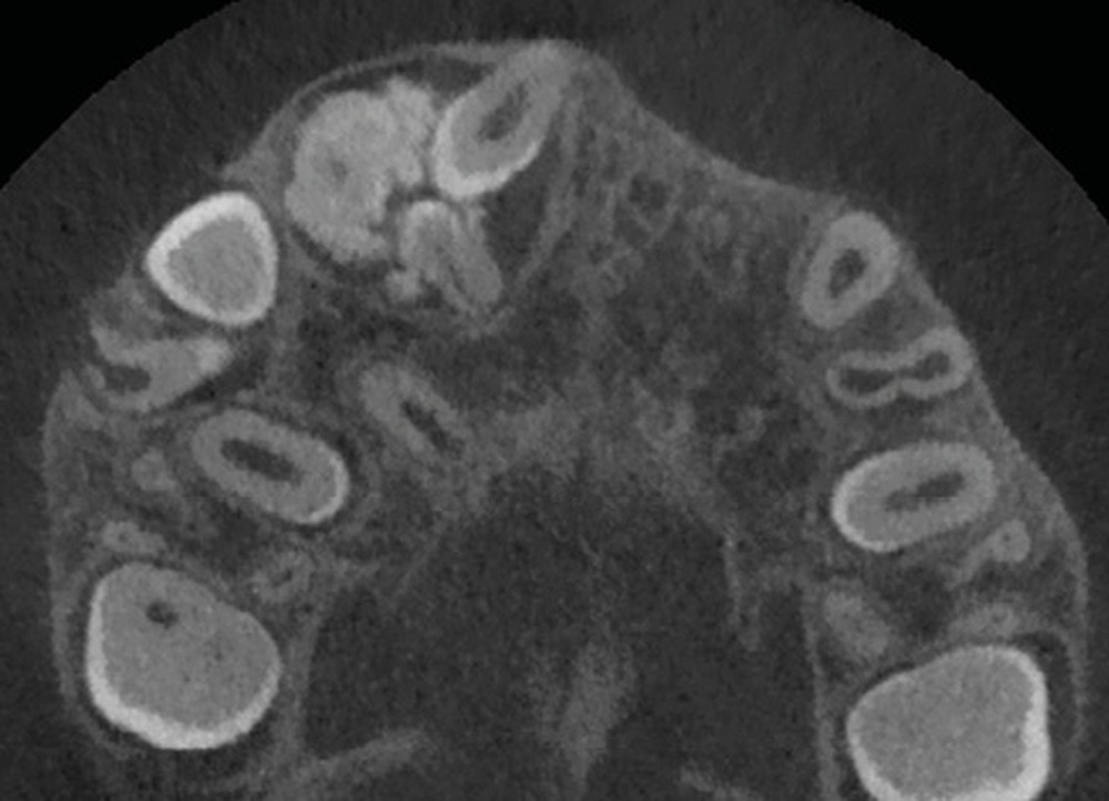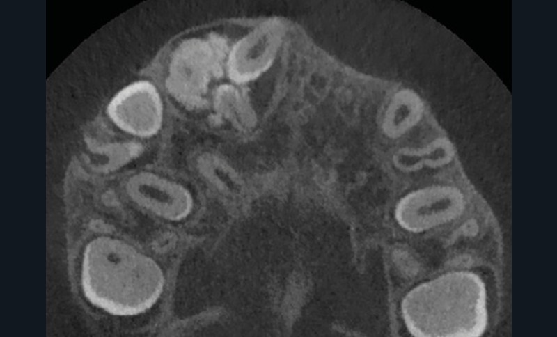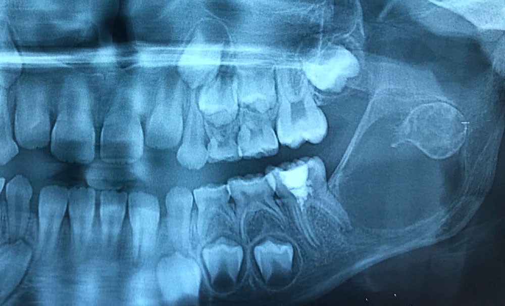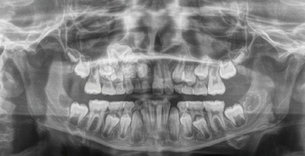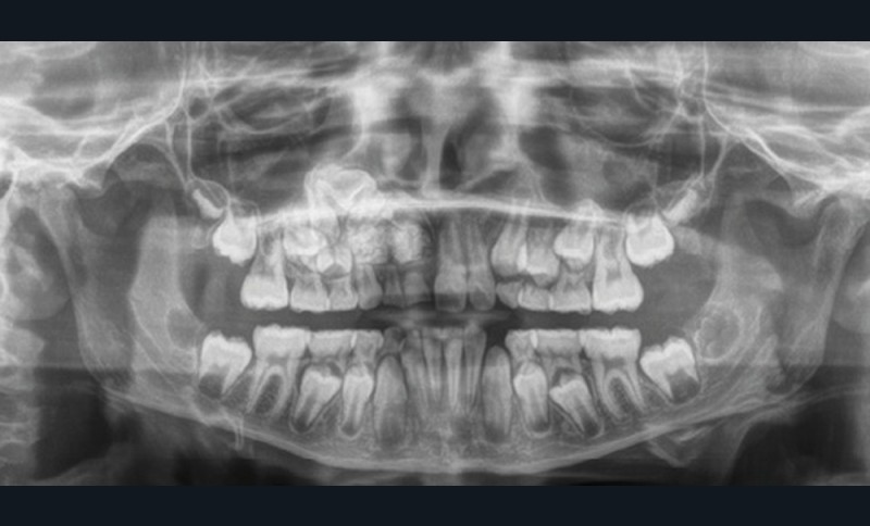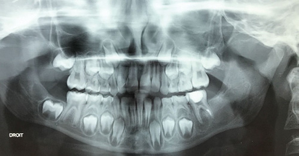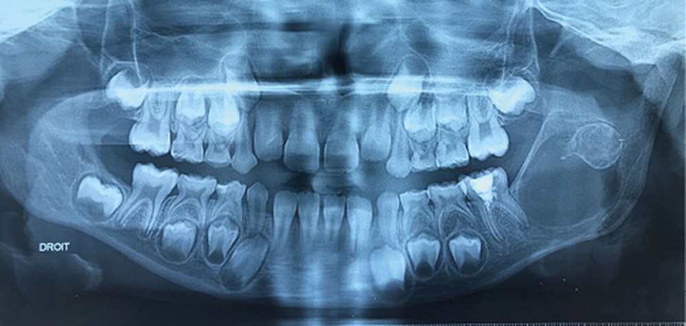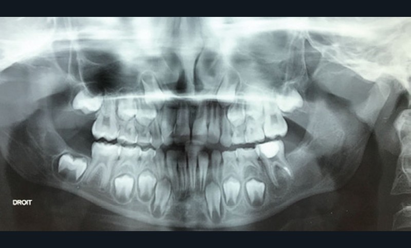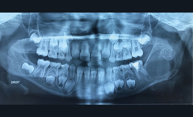 Les kystes et tumeurs bénignes osseuses maxillaires ou mandibulaires chez l’enfant sont le plus souvent asymptomatiques. Ces lésions osseuses sont découvertes de façon fortuite lors d’un bilan radiographique de routine réalisé par l’odontologiste pédiatrique ou l’orthodontiste [1-3]. Néanmoins, des lésions peuvent parfois se développer rapidement et être destructrices [1, 2]. Certains signes cliniques spécifiques à la chronologie de l’éruption dentaire chez l’enfant doivent nous alerter tels qu’un retard d’éruption dentaire ou une éruption dentaire asymétrique (fig. 1). D’autres manifestations cliniques, moins spécifiques à l’enfant, peuvent également orienter le clinicien sur la présence d’une pathologie osseuse sous-jacente : mobilité dentaire, douleur, tuméfaction, limitation de l’ouverture buccale, trouble neurosensoriel, etc. [3]. C’est la radiographie panoramique qui va ensuite mettre en évidence/confirmer la présence d’une lésion intra-osseuse (fig. 2).