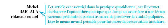 La prise en charge restauratrice des lésions carieuses dentinaires est traditionnellement fondée sur des protocoles opératoires impliquant l’exérèse complète (excavation complète ou EC) en un temps (EC-1) des tissus touchés par le processus carieux. Plusieurs études ont montré que, lors de l’EC-1 de lésions carieuses profondes, des effractions pulpaires étaient réalisées dans environ 50 % des cas [1, 2] et que le taux de succès du coiffage pulpaire direct était faible, inscrivant la dent dans une spirale de soins de plus en plus invasifs (traitements endodontiques et restaurateurs complexes) jusqu’à une avulsion prématurée [3]. Les échecs de la gestion des lésions carieuses profondes ont donc des conséquences néfastes en termes de santé publique et de coût.