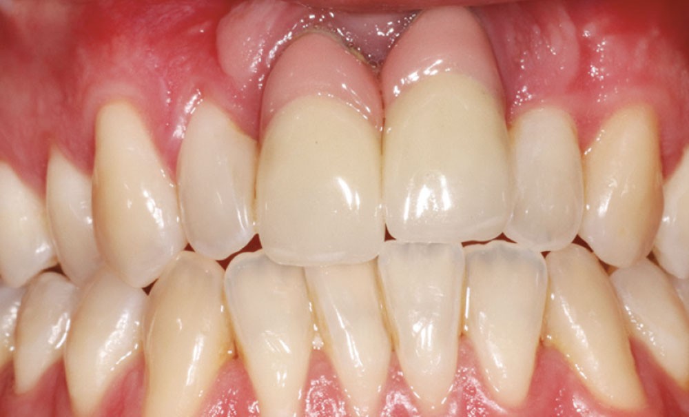 • 13 ans : approfondissement vestibulaire et création de tissu kératinisé apicalement aux 11 et 21 par autogreffe gingivale [2].