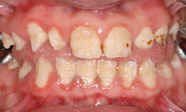 Sur le plan phénotypique, il existe 4 formes reconnues d’amélogenèse imparfaite : hypoplasique, hypomature, hypominéralisée et mixte [6]. La forme hypoplasique est caractérisée par un émail d’épaisseur réduite, dont la surface peut présenter des puits ou des fissures. Dans la forme hypominéralisée, l’émail est friable, décoloré et s’élimine rapidement. Dans le type hypomature, l’émail a un aspect opaque et crayeux. Ces défauts amélaires peuvent être associés à des problèmes éruptifs, une attrition sévère, une perte de dimension verticale d’occlusion (DVO) et des problèmes de béance [7]. Si les complications les plus sévères se rencontrent dans la forme hypominéralisée, les doléances esthétiques sont toujours exprimées par les patients, quelle que soit la forme d’amélogenèse imparfaite [8]. Radiologiquement cette affection se manifeste par des couronnes de morphologie altérée, parfois une disparition de la couche d’émail ou un émail de densité similaire à celle de la dentine.