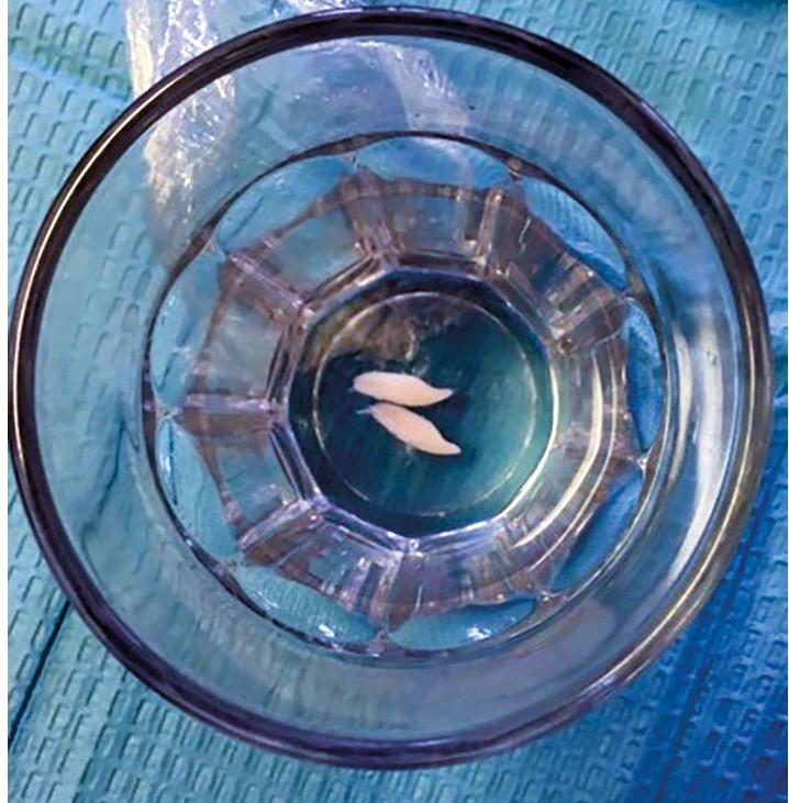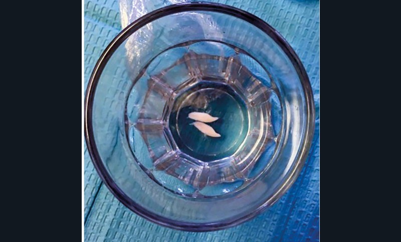 ► L’examen endo-buccal montre une absence de 31/41 sur l’arcade (fig. 1). Celles-ci sont conservées dans du sérum physiologique dans un verre depuis seulement quelques heures (fig. 2).