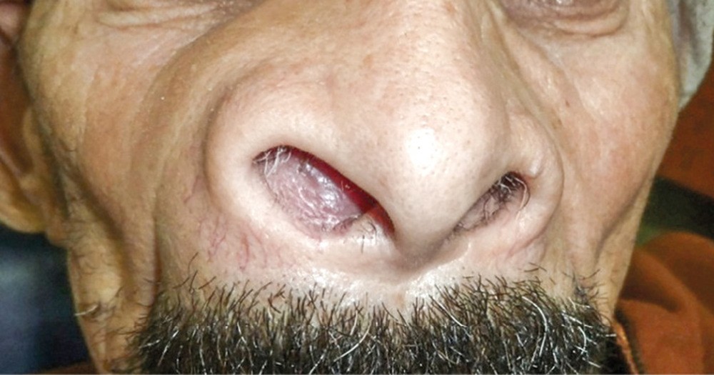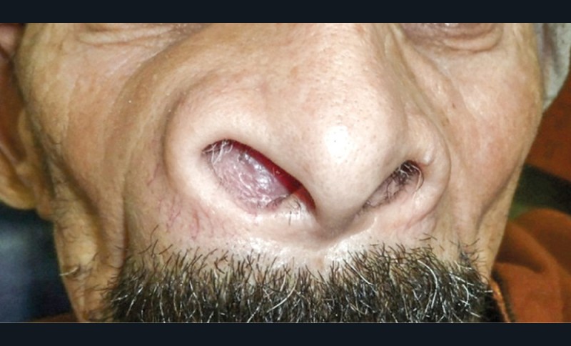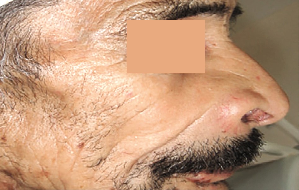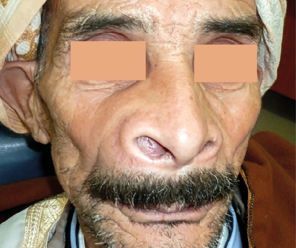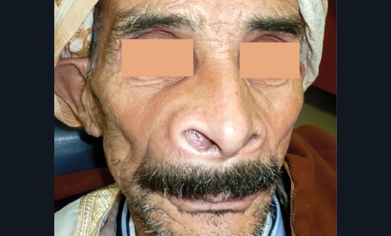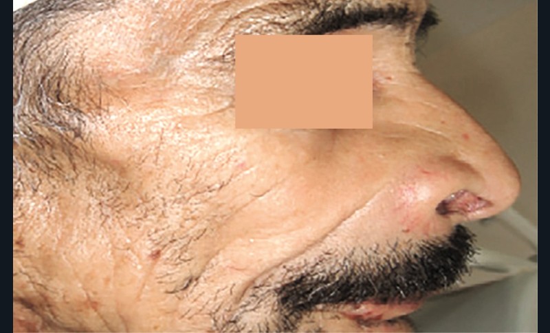 Le patient indique qu’il a remarqué, dix ans plus tôt, l’apparition d’une tuméfaction de volume réduit au niveau de la région nasolabiale côté droit, asymptomatique. Cette dernière a pris du volume progressivement jusqu’à devenir importante et déformer la face. Elle est douloureuse par moments, avec l’apparition d’une voix nasonnée et d’une légère gêne respiratoire due au gonflement narinaire.