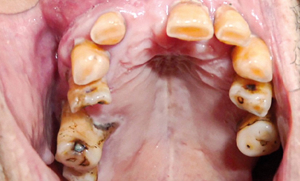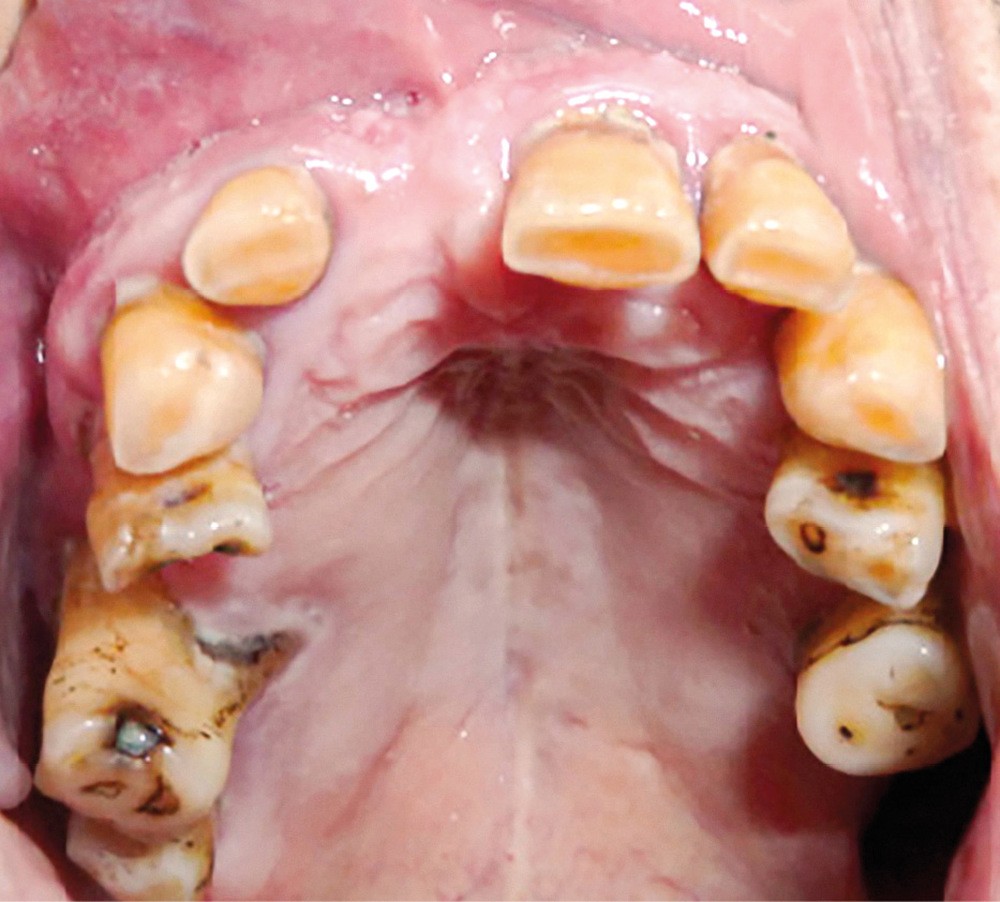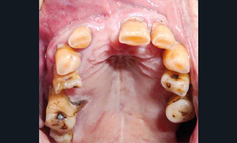L’examen intra-oral montre un comblement au fond du vestibule au niveau de tout le secteur antérieur depuis l’incisive centrale gauche (21) jusqu’à la première prémolaire droite (14), la muqueuse est d’aspect sain (fig. 4). La palpation vestibulaire haute révèle une masse élastique sous-muqueuse située au niveau du plancher nasal antérieur, dépressible et légèrement douloureuse.