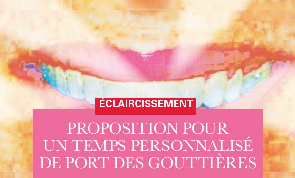 Nous savons que les sensibilités lors de l'éclaircissement externe ambulatoire sont liées au temps de port de la gouttière. Par ailleurs, il est aussi démontré qu'une heure d'application du produit d'éclaircissement suffit à obtenir un bon résultat. C'est pourquoi cet article propose pour chaque patient un temps d'application personnalisé de port des gouttières d'éclaircissement (entre une et huit heures) afin d'éviter les sensibilités.