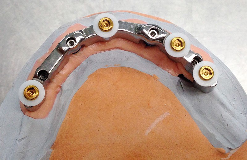 En effet, la première suprastructure, de par sa conception, ne permet pas une bonne stabilité prothétique : l’association d’une barre non fraisée avec des attachements de type “poires” (M3 Ceka) ne peut que procurer une bascule antéro-postérieure de la prothèse (fig. 2).