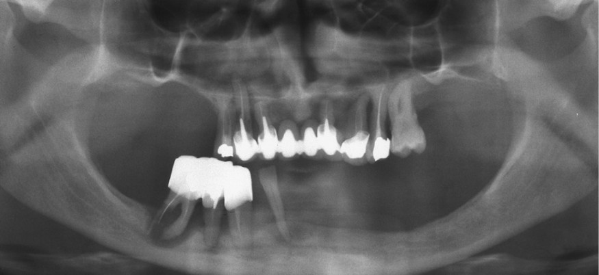 Il s’agit d’une patiente de 64 ans n’ayant pas d’antécédent particulier, qui est prise en charge dans le service de chirurgie maxillo-faciale du CHU de Nantes pour une situation dentaire préterminale au niveau maxillaire et mandibulaire (fig. 1).