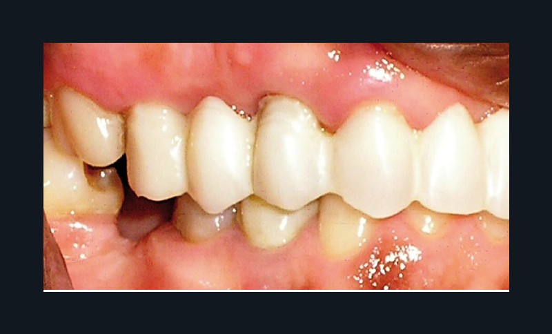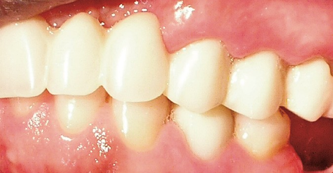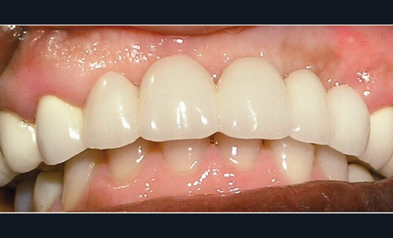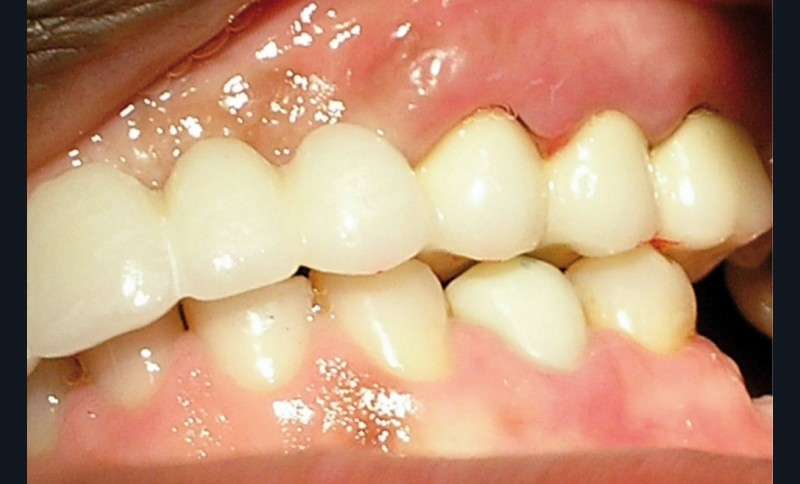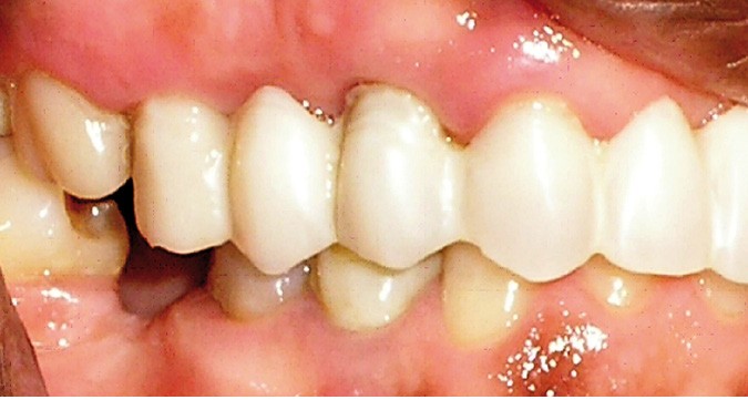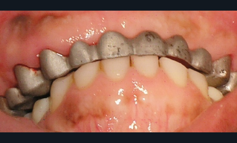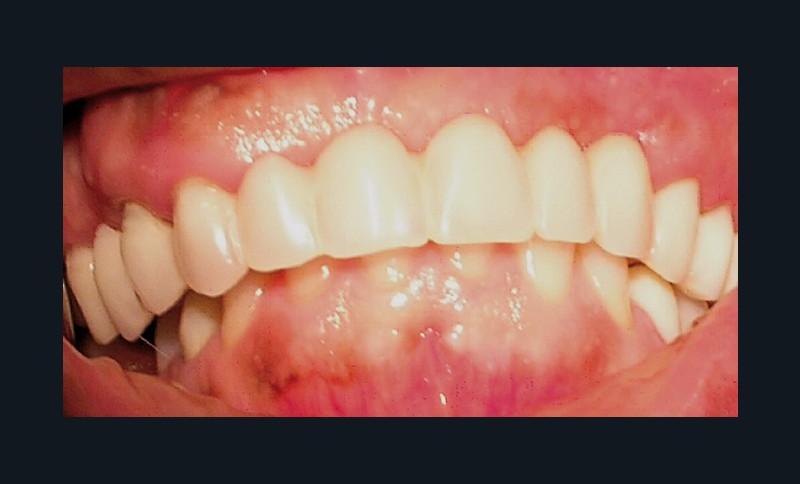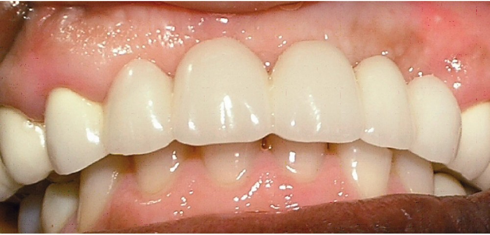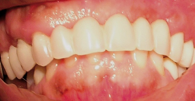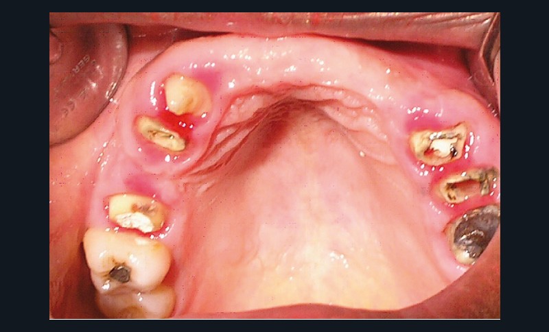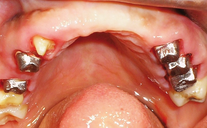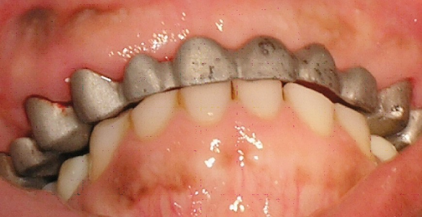 La patiente a été porteuse d’un bridge céramo-métallique de onze éléments au maxillaire pendant huit mois (fig. 1, 2), puis d’un bridge transitoire au maxillaire (fig. 3). Elle signale quelques rares épisodes de saignement probablement dus à l’irritation par la prothèse. Cette dernière se descelle couramment, créant ainsi un préjudice fonctionnel, esthétique et psychologique.