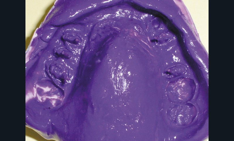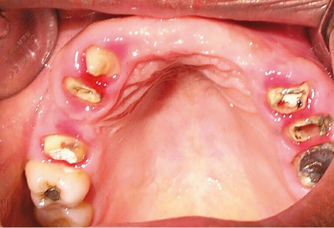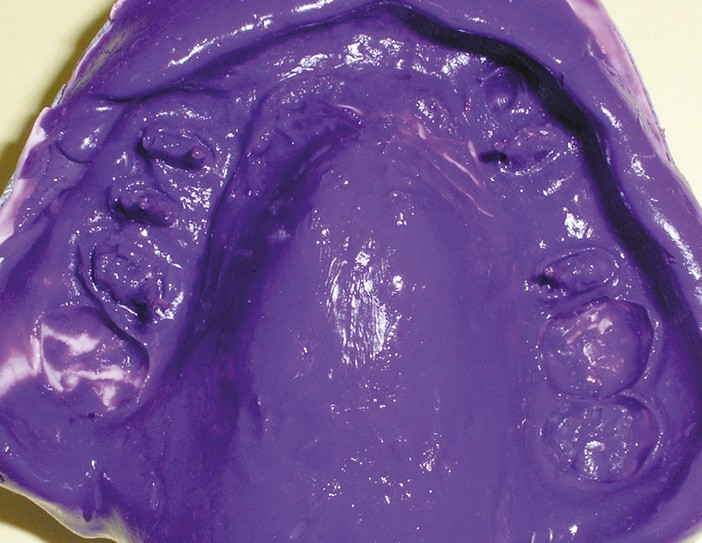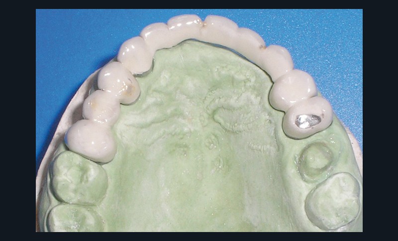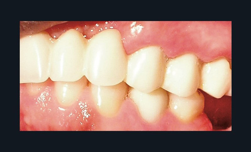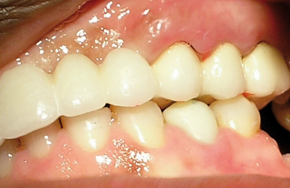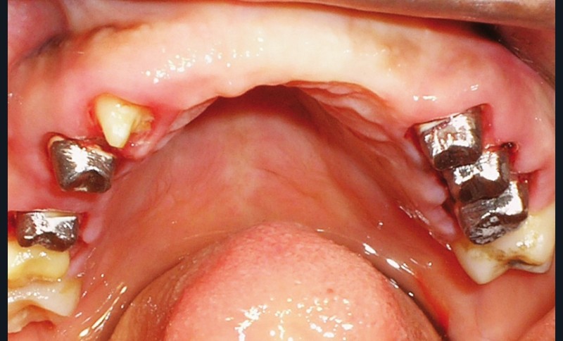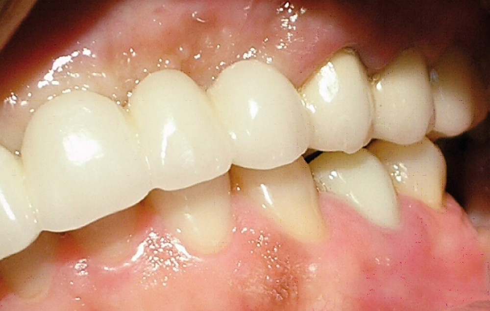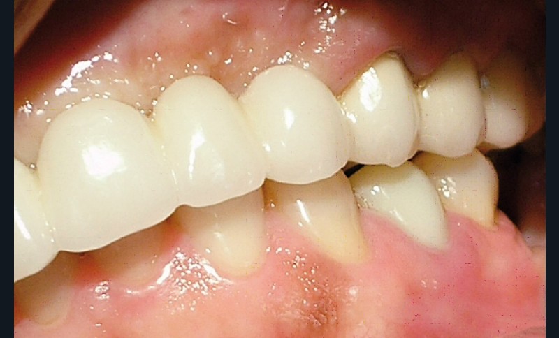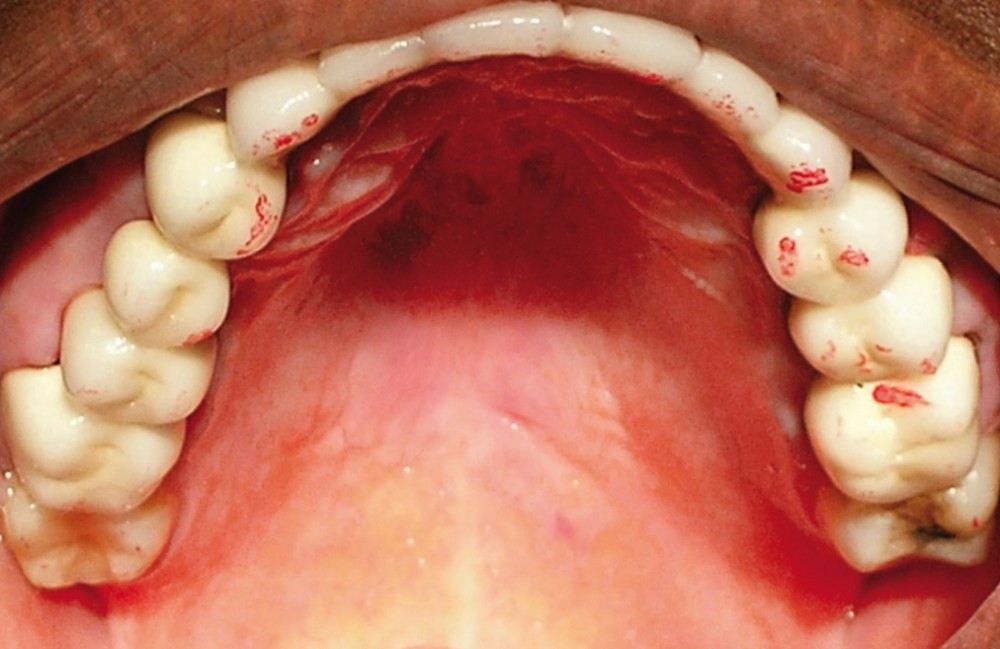 La patiente a été porteuse d’un bridge céramo-métallique de onze éléments au maxillaire pendant huit mois (fig. 1, 2), puis d’un bridge transitoire au maxillaire (fig. 3). Elle signale quelques rares épisodes de saignement probablement dus à l’irritation par la prothèse. Cette dernière se descelle couramment, créant ainsi un préjudice fonctionnel, esthétique et psychologique.