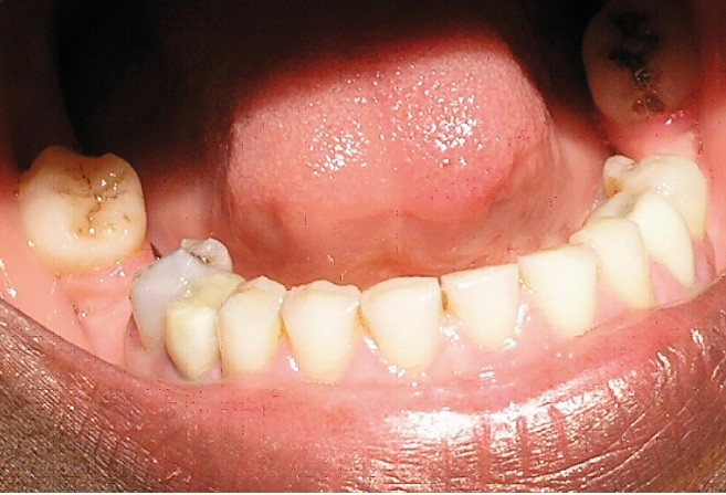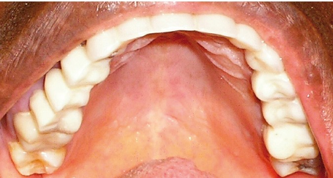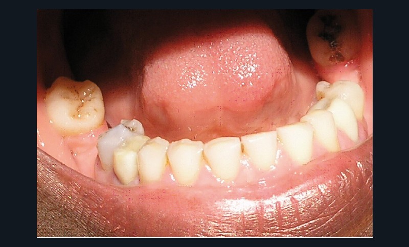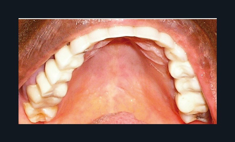 L’examen dentaire ne montre pas de mobilité dentaire. À l’arcade maxillaire, les dents 11, 14, 21, 22, 23 sont absentes. Les dents 13, 15, 24, 25 sont à l’état de racine (fig. 4). Nous notons des reconstitutions coronaires à l’amalgame sur les 26 et 16. À l’arcade mandibulaire, les dents 37, 36, 46, 47 sont absentes et une obturation coronaire à l’amalgame sur 38 est en place. Les bords libres du groupe incisivo-canin et les cuspides des prémolaires sont légèrement abrasés (fig. 5).