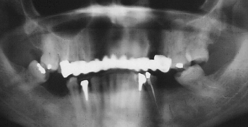 - Examen radiographique : l’orthopantomogramme ne révèle aucune lésion apicale (fig. 6). Les traitements endodontiques semblent corrects. Des ancrages corono-radiculaires sont visibles sur 34 et 44.