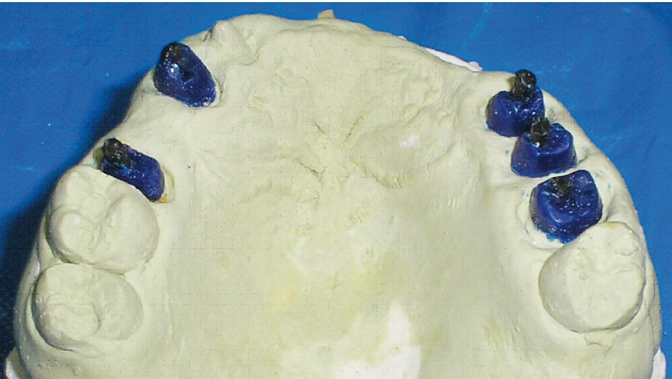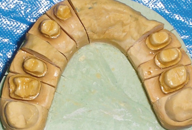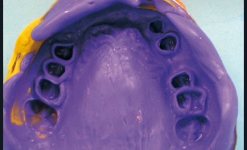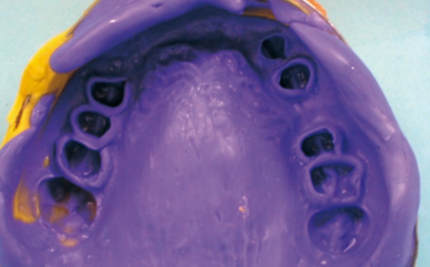 Réalisation des restaurations corono-radiculaires coulées : l’empreinte pour les RCRC sur les 15, 14, 24, 25 et 26 est réalisée selon la wash technique (fig. 8).