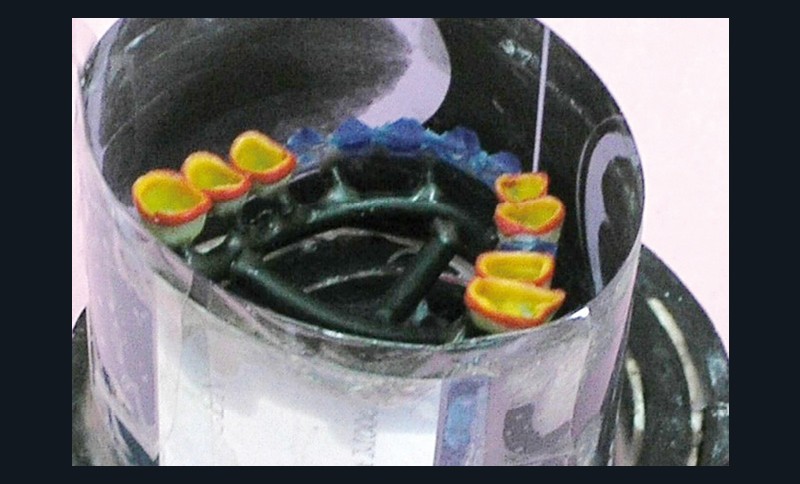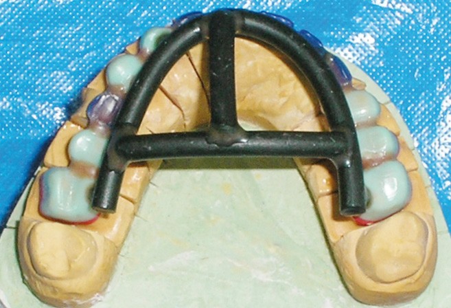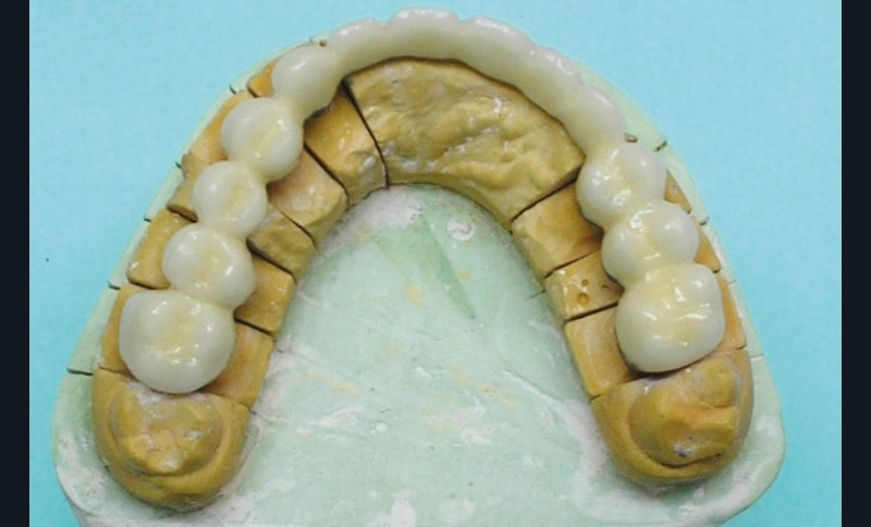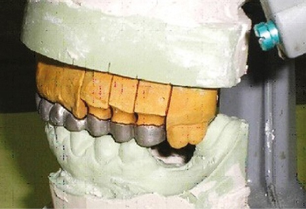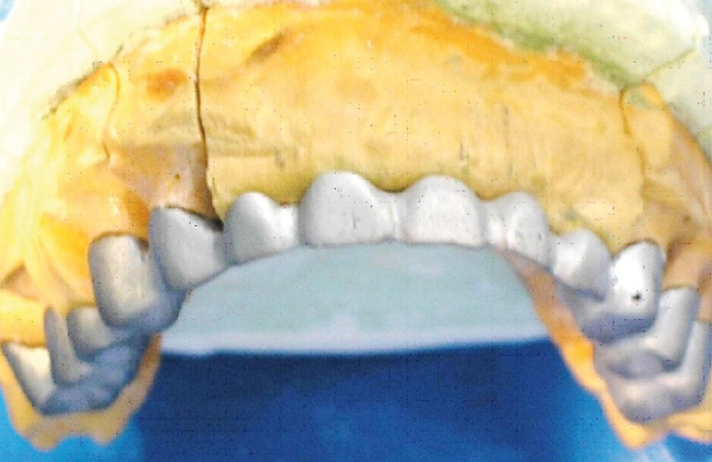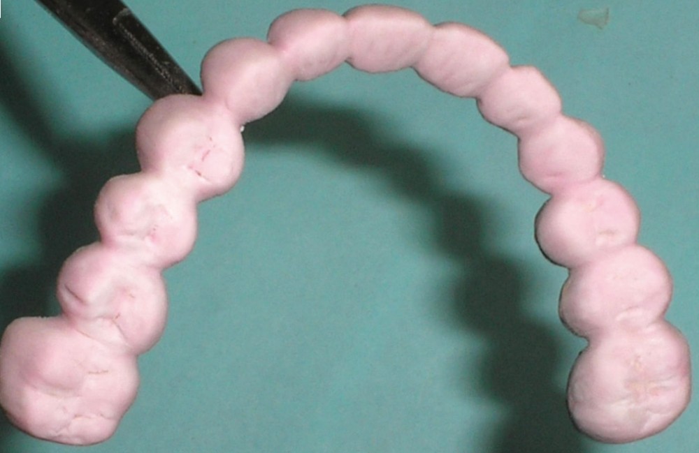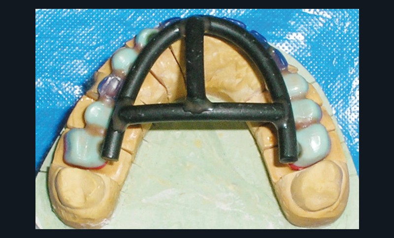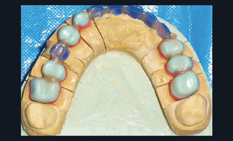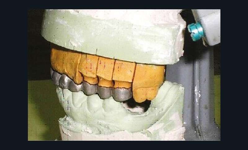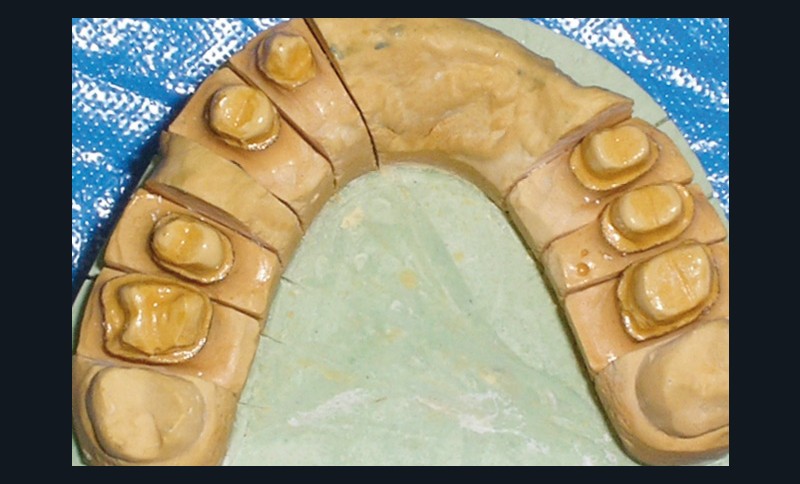 - Cire de diagnostic : le wax-up, ou cire de diagnostic, a été effectué (fig. 7). Ce guide référentiel thérapeutique permet de concrétiser le projet prothétique d’un point de vue esthétique et fonctionnel ; il constitue un outil indispensable de communication à la triade patient/praticien/prothésiste [10-12].