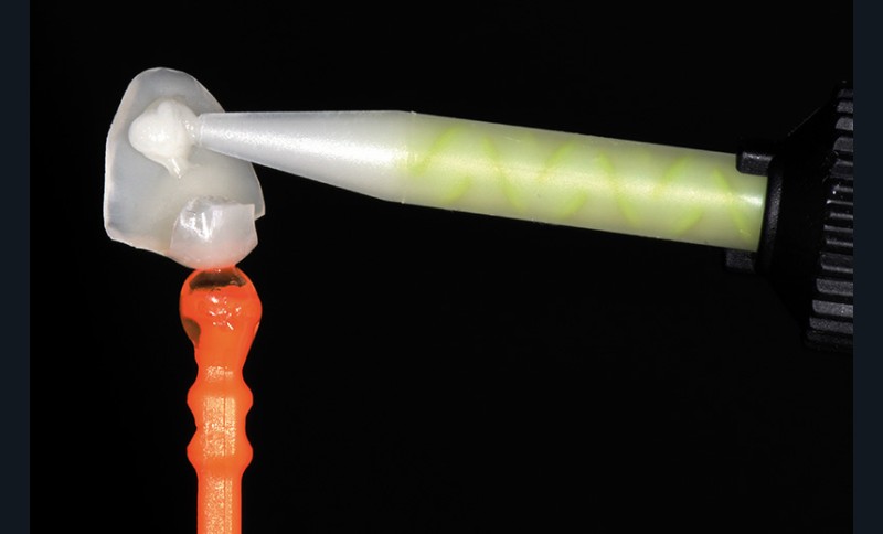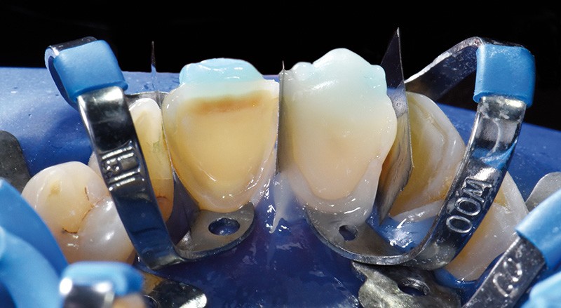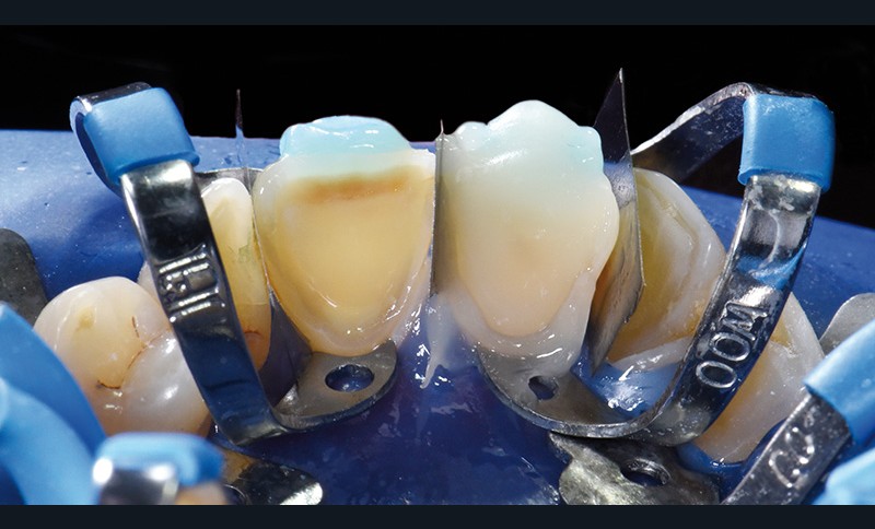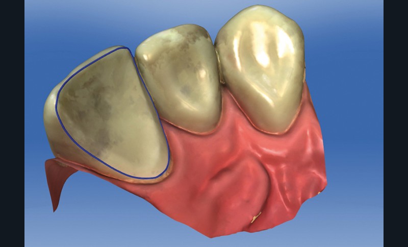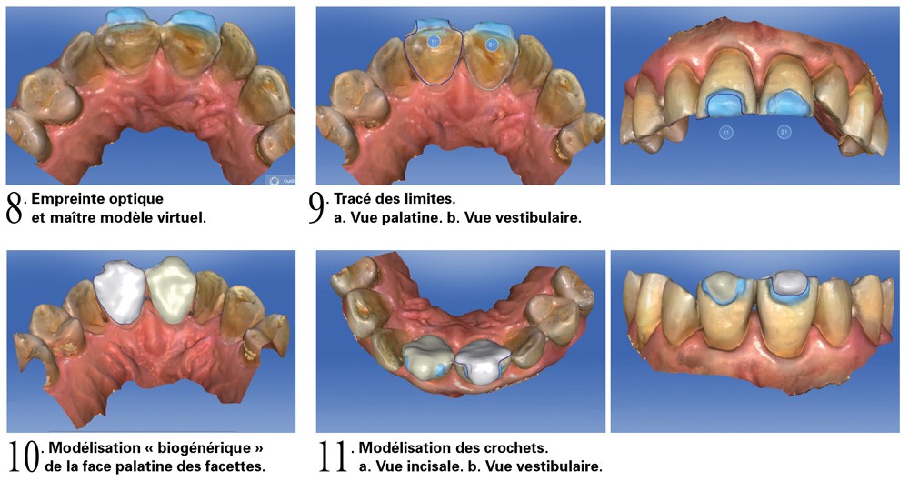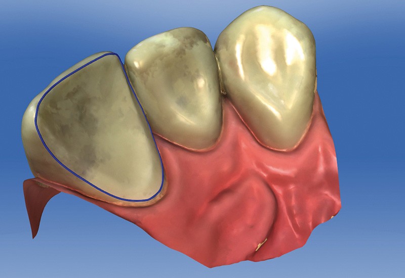 La maîtrise des outils de CFAO dentaire permet d’adapter le protocole clinique à des situations complexes tout en ouvrant la voie à l’utilisation de nouveaux matériaux, plus performants. Cette technique met en avant un des intérêts de la CFAO directe, puisque l’ensemble du traitement est réalisé en une seule séance. En effet, il n’est pas envisageable de laisser en place la résine bleue apposée sur les faces vestibulaires dans le cas d’un traitement semi-direct (réalisé en deux séances).