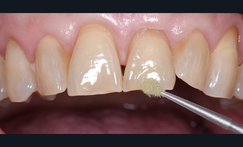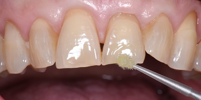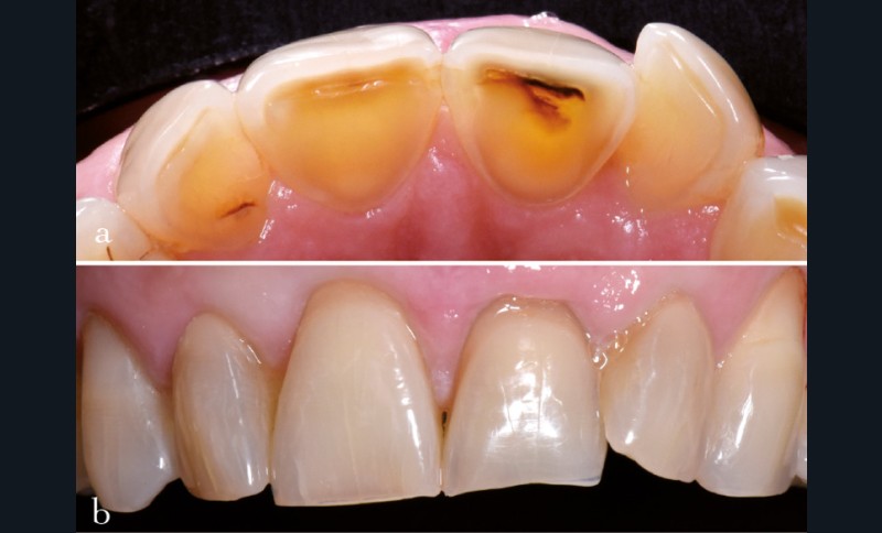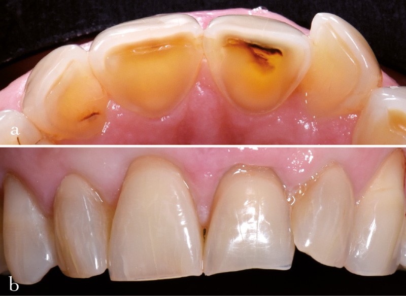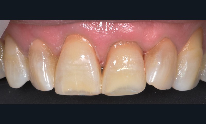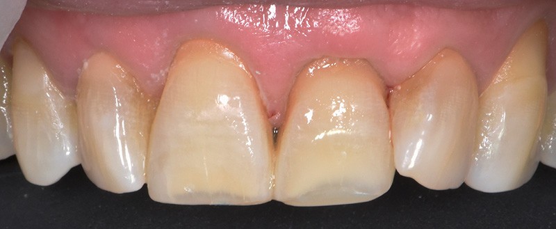 La patiente, âgée de 59 ans, présente une érosion marquée (classe III de la classification ACE) des faces palatines de ses deux incisives centrales (fig. 2a). Elle se plaint de sensibilités importantes au niveau de ces incisives et souhaite corriger la différence de niveau du bord libre de 21 (fig. 2b).