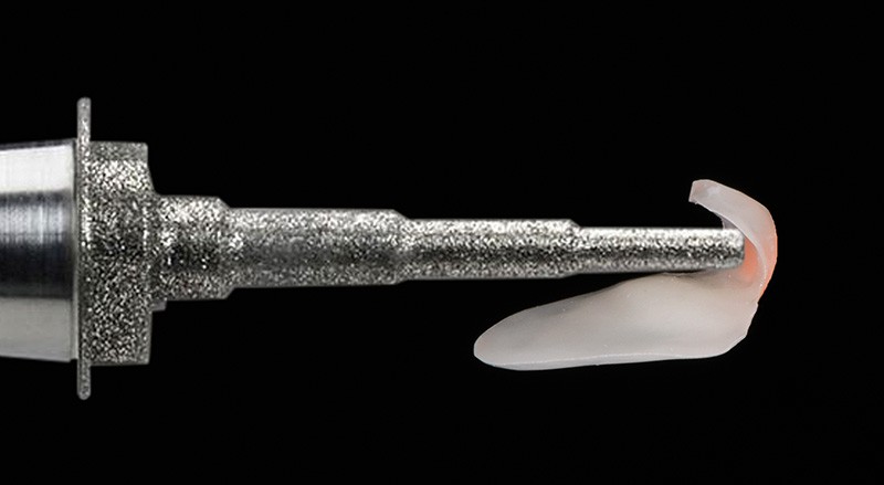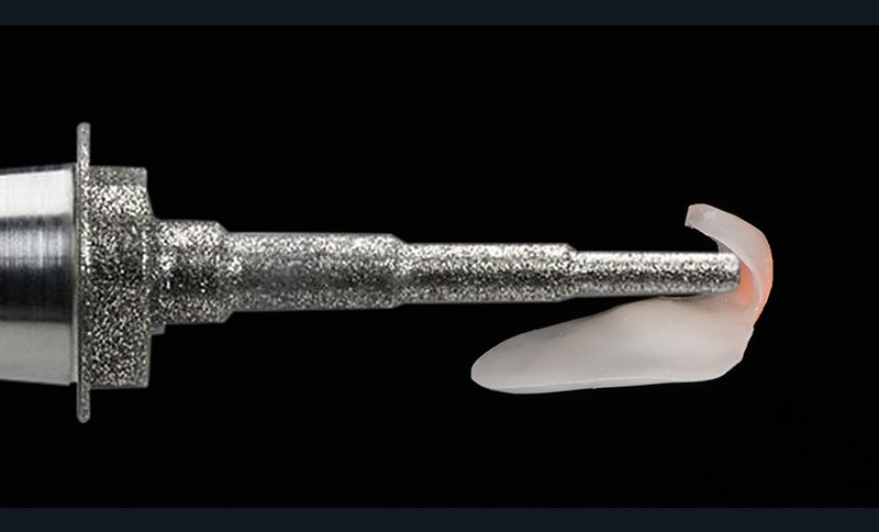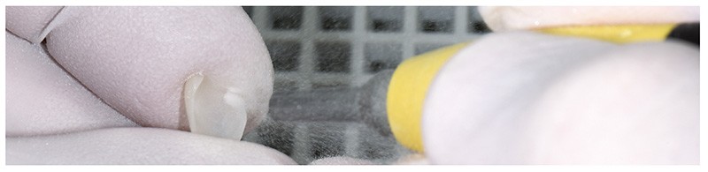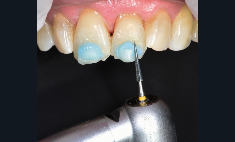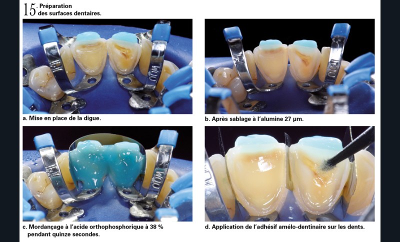 Après élimination des excès de matériau d’assemblage à l’aide d’un pinceau à usage unique, la colle composite est photopolymérisée pendant vingt secondes à 1 200 mW/cm2. Les résidus de colle sont ensuite éliminés à l’aide d’une lame de bistouri n° 12. Un gel de glycérine est alors appliqué sur les joints de collage et une seconde photopolymérisation de quarante secondes à 1 200 mW/cm2 est effectuée. Après retrait de la digue, les crochets sont supprimés à l’aide d’une fraise multilames sur turbine (H 135 Q – Komet). Cette étape est grandement simplifiée par la couleur bleue de la résine appliquée en début de séance sur les faces vestibulaires (fig. 18).
