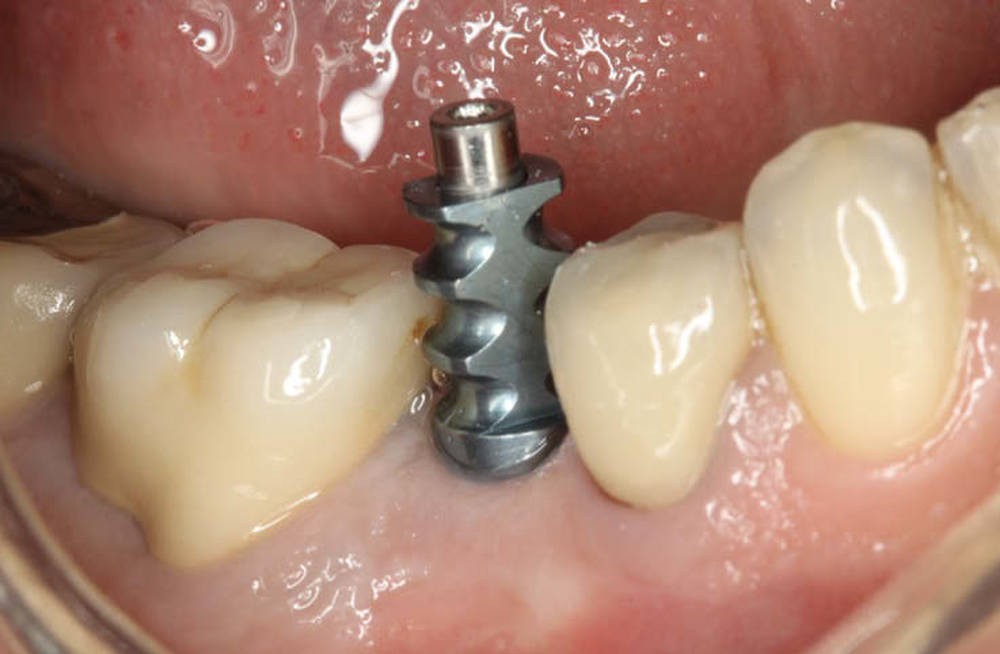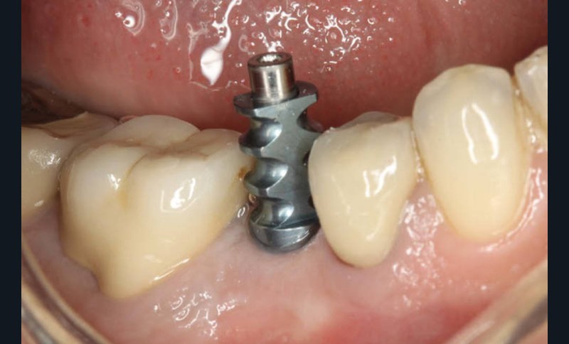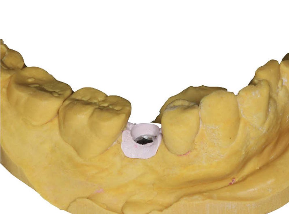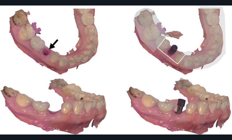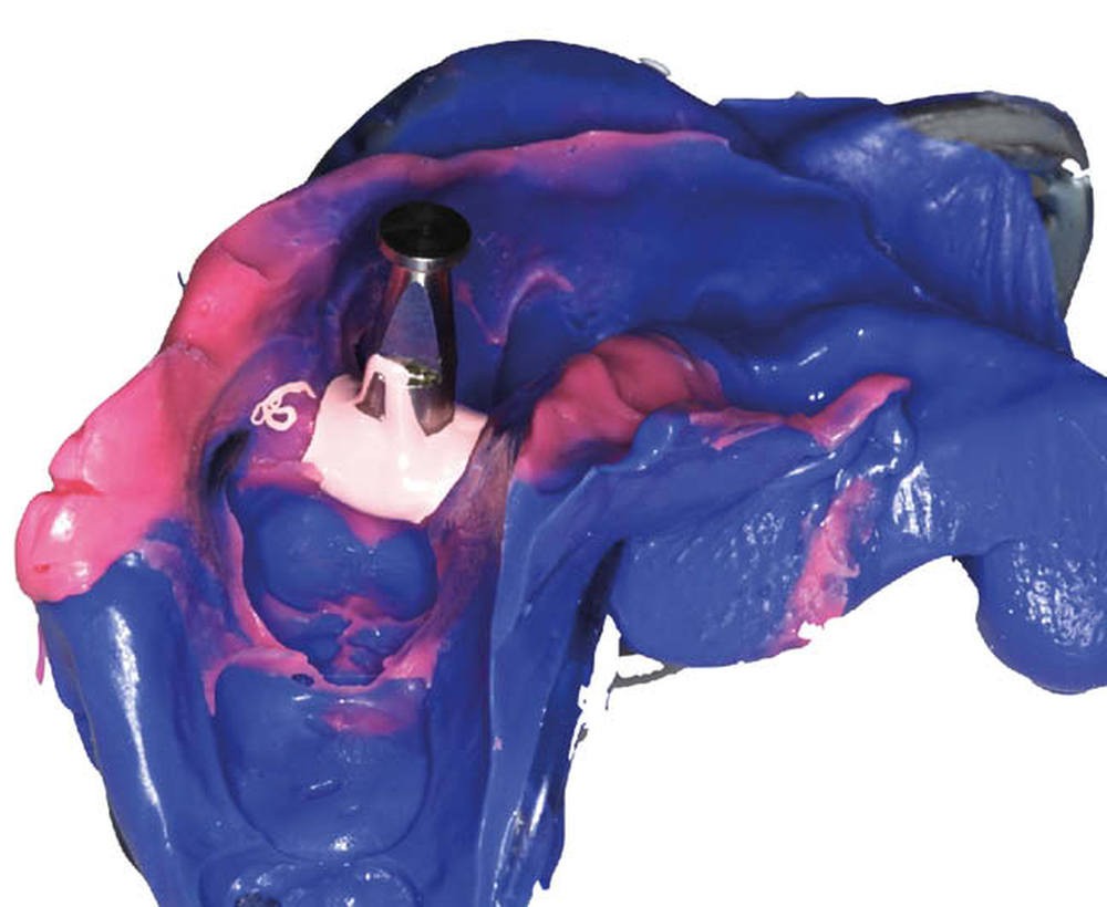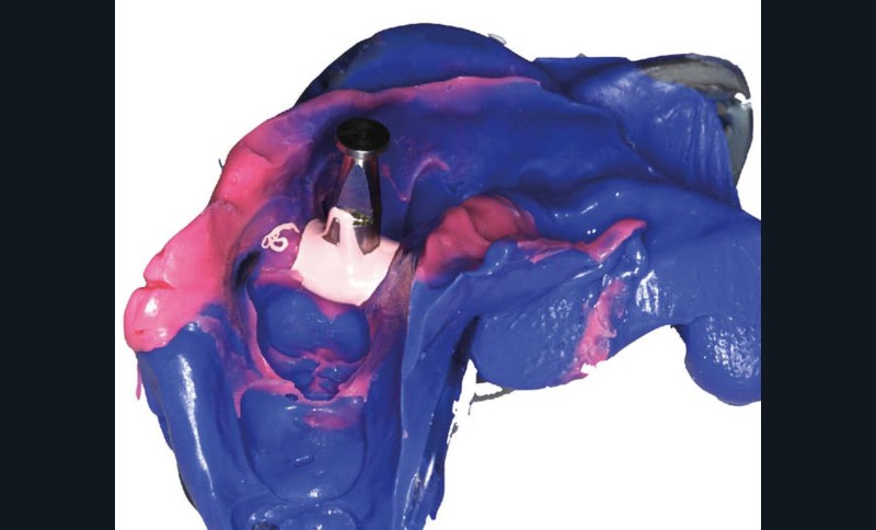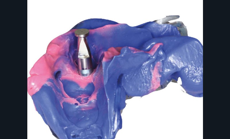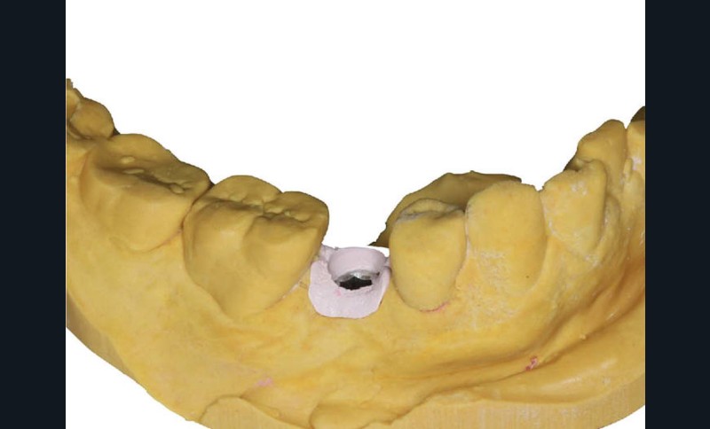 - un modèle est imprimé à partir d’un fichier numérique au format STL. Il comporte, au niveau du site implantaire, une cavité dans laquelle l’analogue métallique sera inséré manuellement pour reproduire la situation clinique…