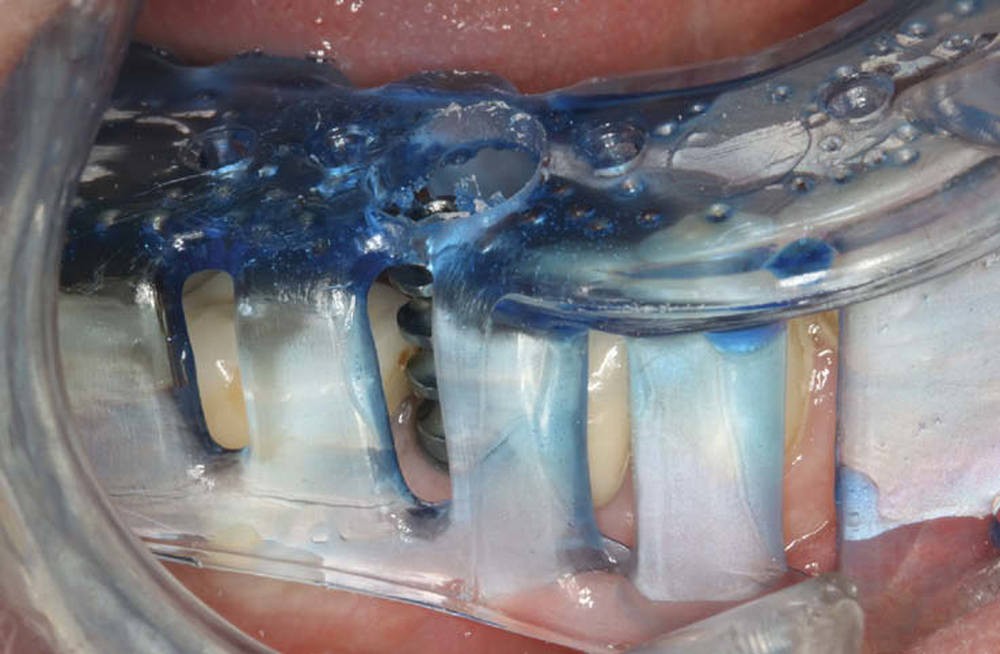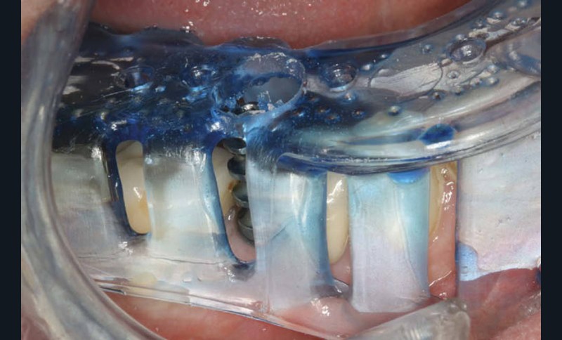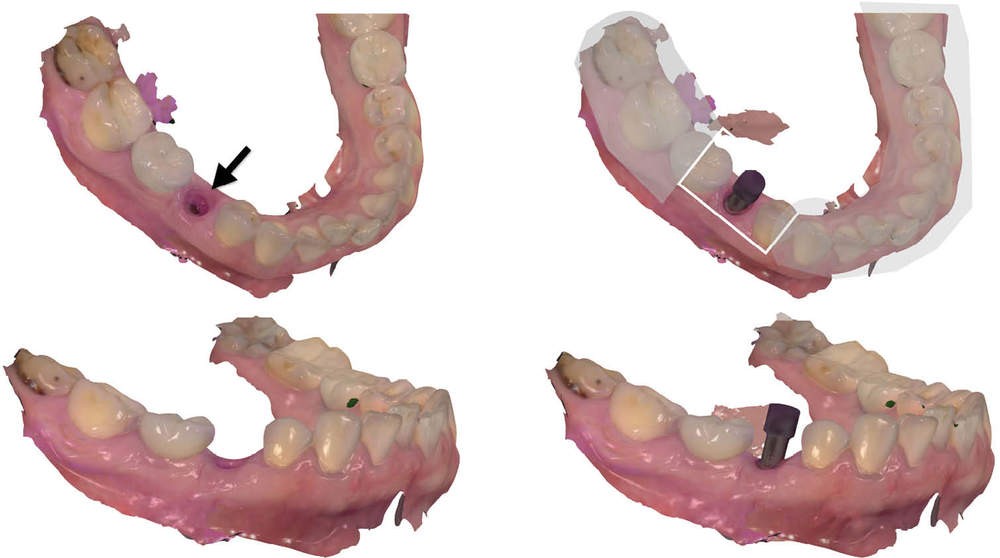 - après retrait de la vis de cicatrisation, la première phase enregistre l’arcade et la zone muqueuse périphérique à l’implant. Le transfert est alors mis en place, l’enregistrement se concentre alors uniquement sur le transfert et les dents collatérales (fig. 3a-d) ;